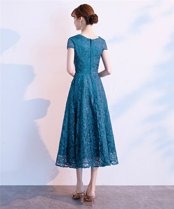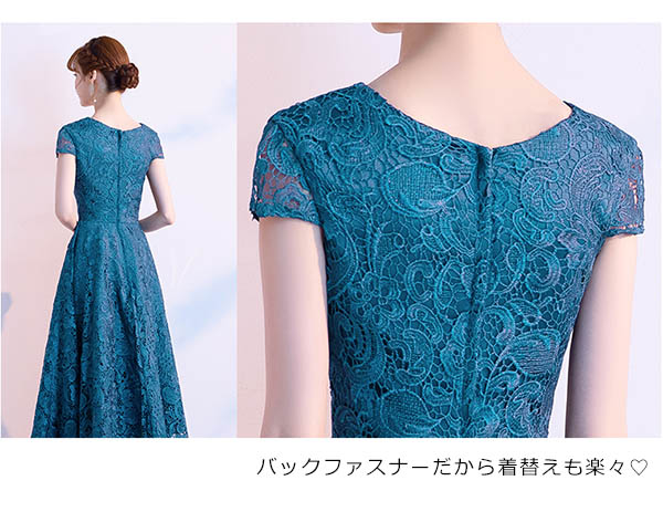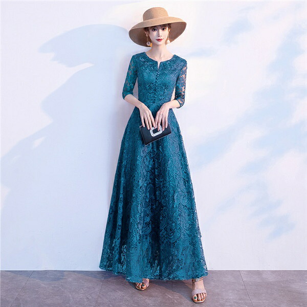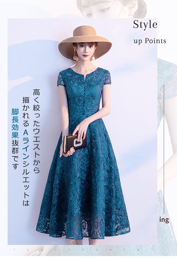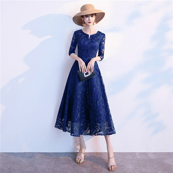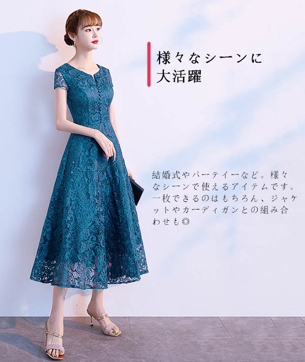大人女性 ピアノ発表会 結婚式 パーティー対応 袖付き(半袖・五分袖)ミモレ丈で低身長OK フェミニンデザイン ブラック ネイビー ワインレッド 大きいサイズ