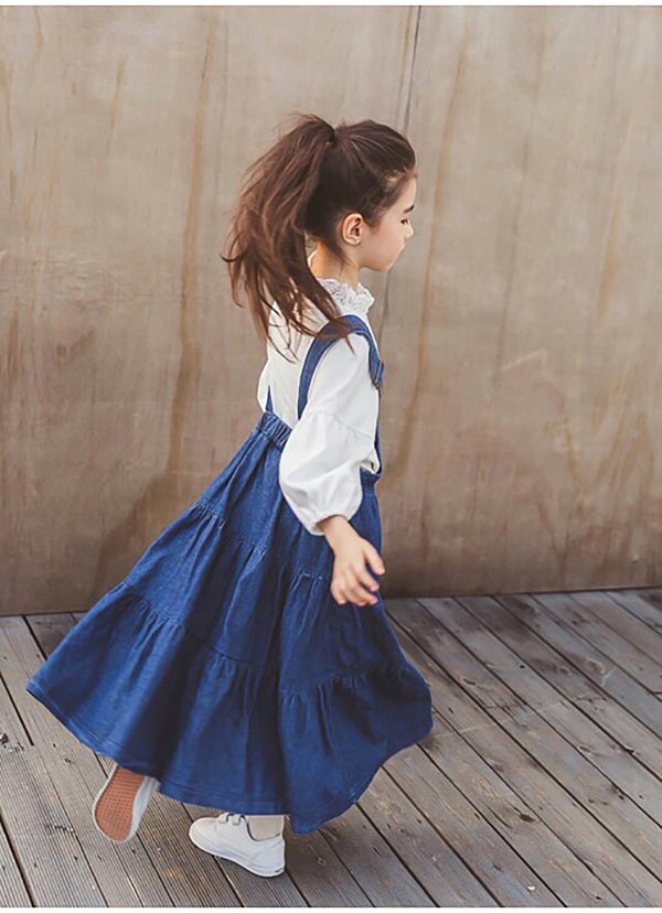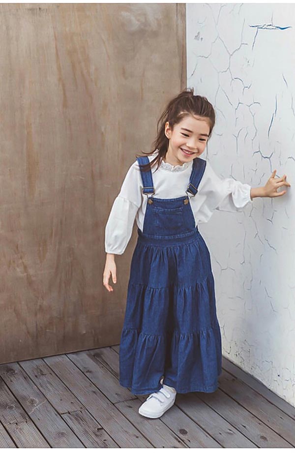 韓国風デニムワンピース 子ども服 春秋新作 サスペンダースカート ロング丈 女の子 通園 通学 お出かけ用 幼児 小学生対応