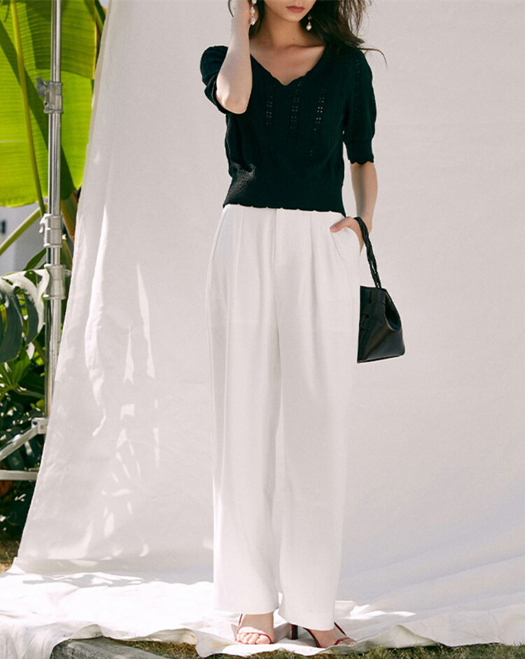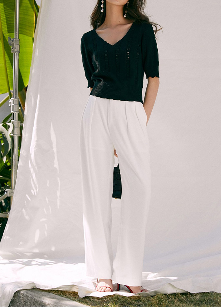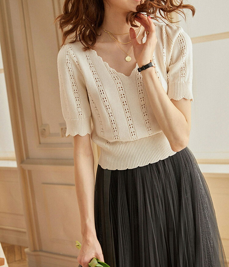 ニット カットソー 透かし編み 半袖 Vネック トップス レディース 春 夏 シースルー プルオーバー サマーニット きれいめ おしゃれ ホワイト ブラック カジュアル 体型カバー 韓国ファ シンプル
