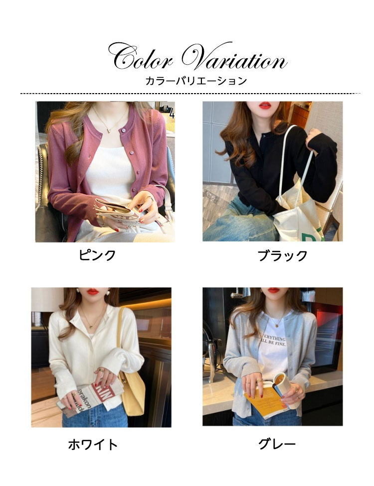 カラーバリエーションは4色展開で、どの色もコーディネートのアクセントになる魅力的な色合いです。長袖デザインは、紫外線から肌を守るUVカット機能も兼ね備えており、日差しの強い日にも安心です。カジュアルからビジネスシーンまで、幅広い場面で活躍するこのカーディガンは、一枚持っていると非常に便利です。