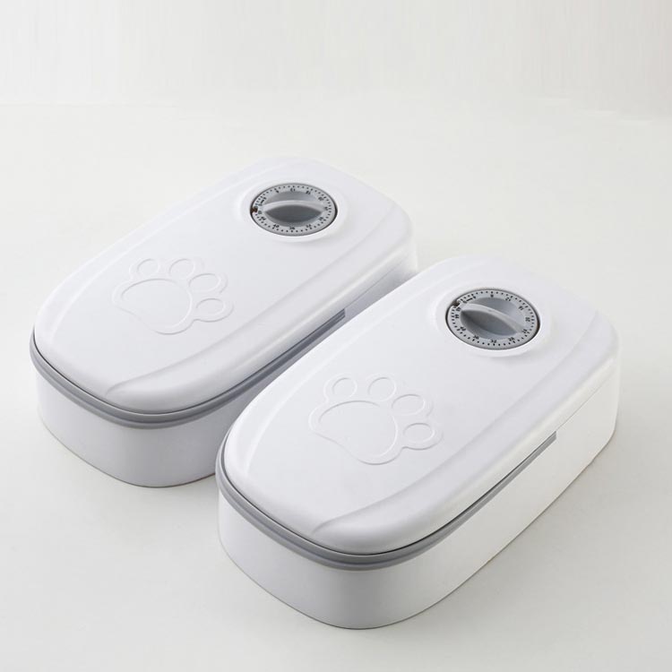 2つの独立したトレイで2食分の餌やりが可能!ペット用 自動給餌器。時計表示:48時間表示