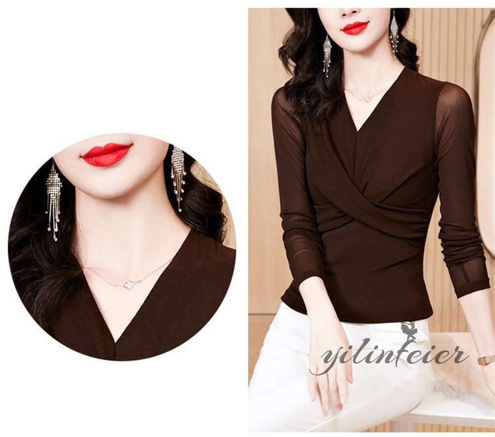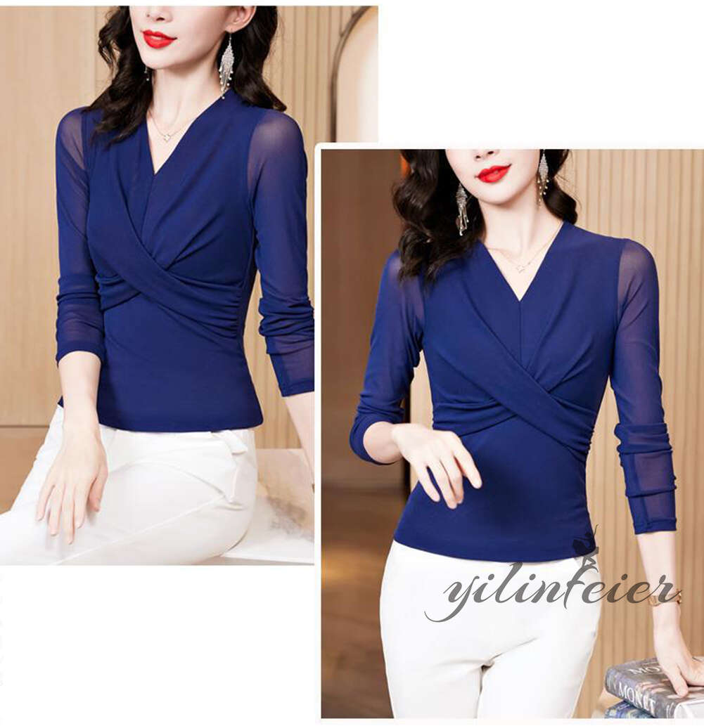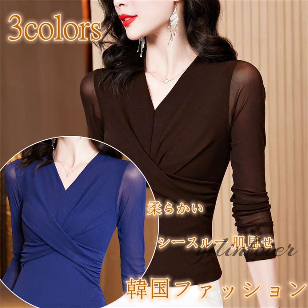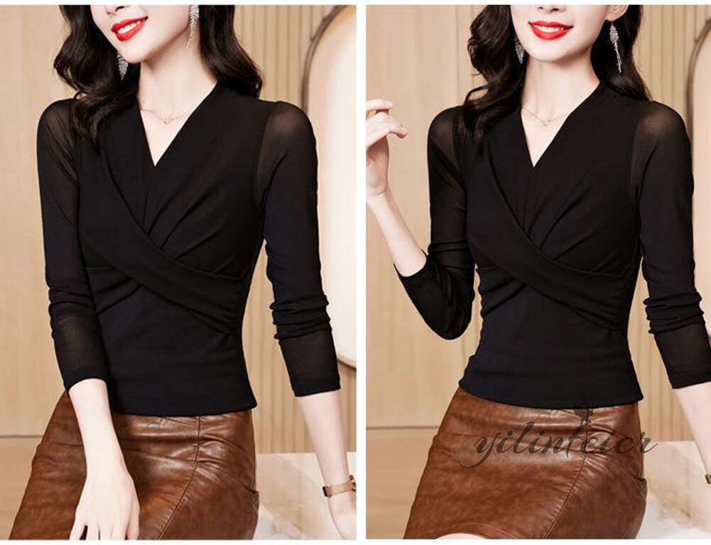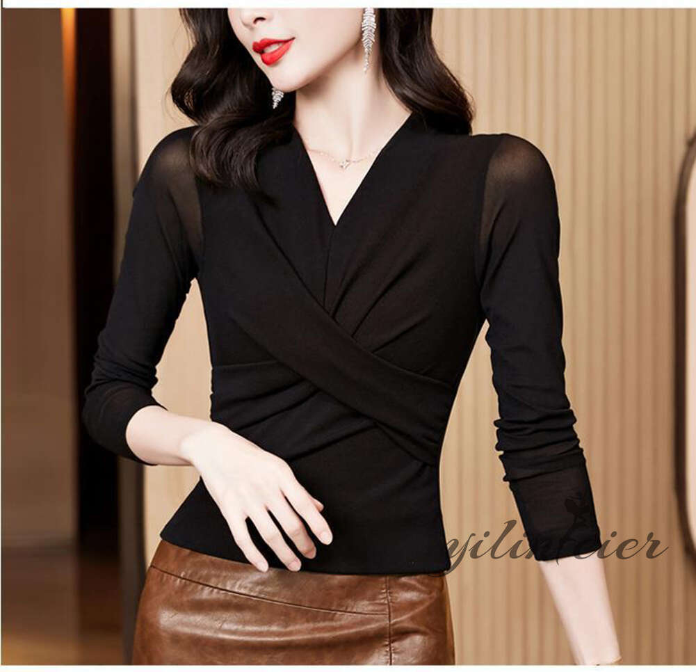 レディース トップス Vネック 無地 シースルー インナー 日常着 通勤通学 社交ダンス モダンダンス ダンスTシャツ ダンスウェア レッスン着 長袖 肌見せ 透け カットソー