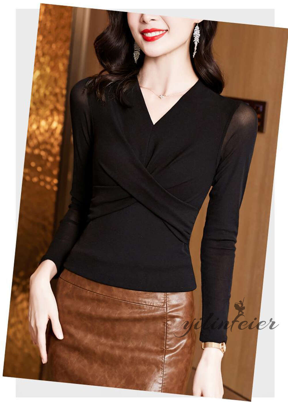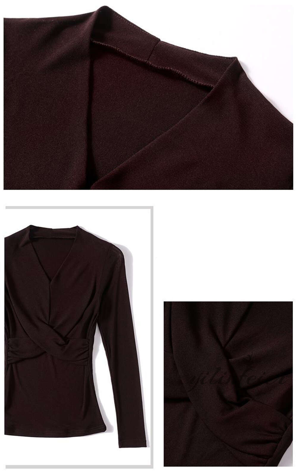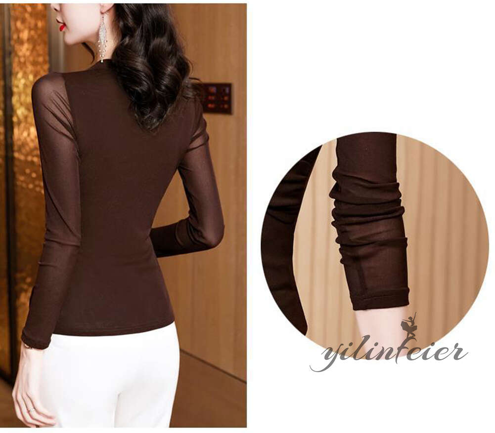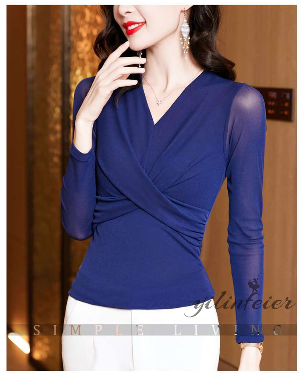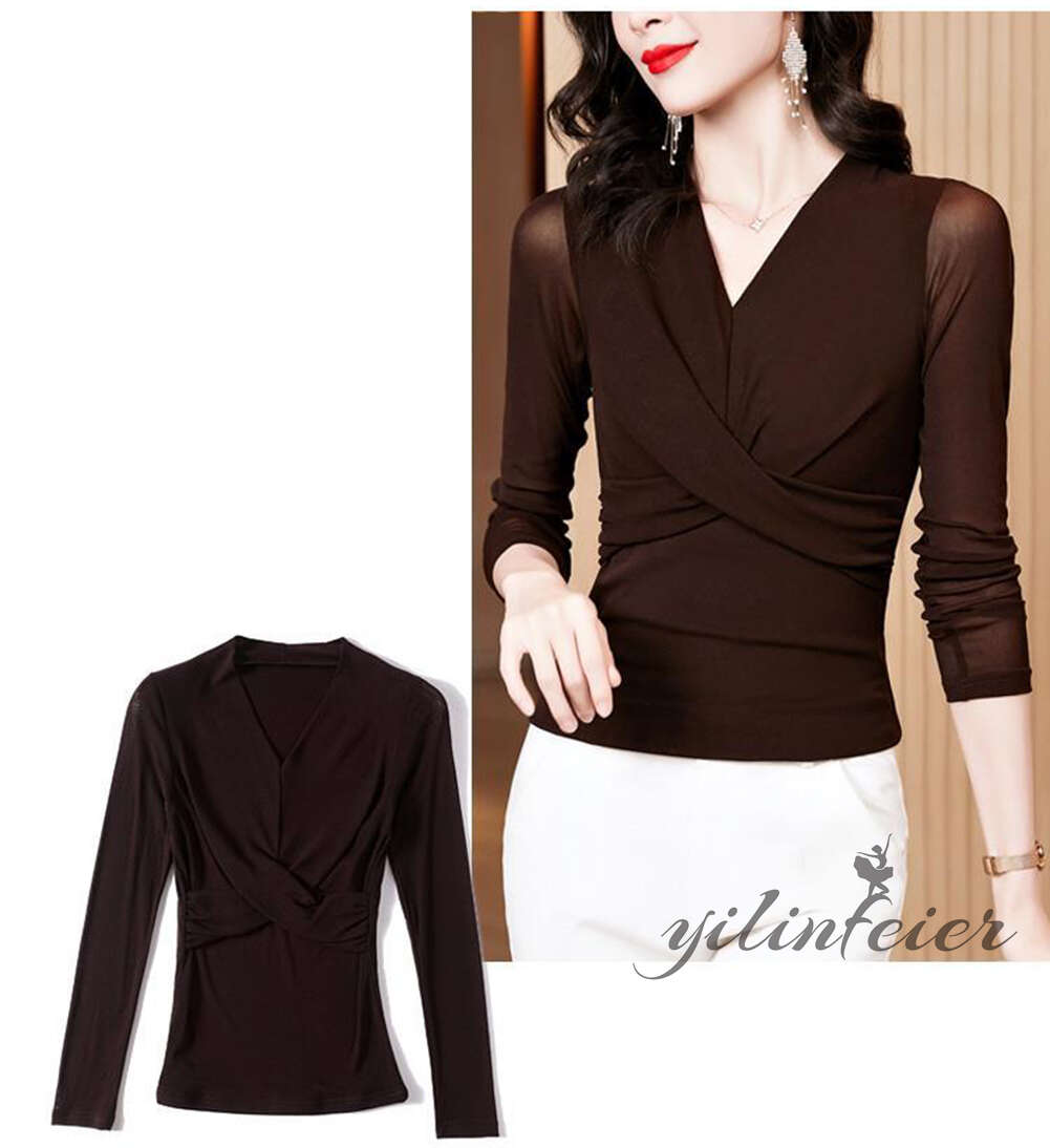 レディース トップス Vネック 無地 シースルー インナー 日常着 通勤通学 社交ダンス モダンダンス ダンスTシャツ ダンスウェア レッスン着 長袖 肌見せ 透け カットソー