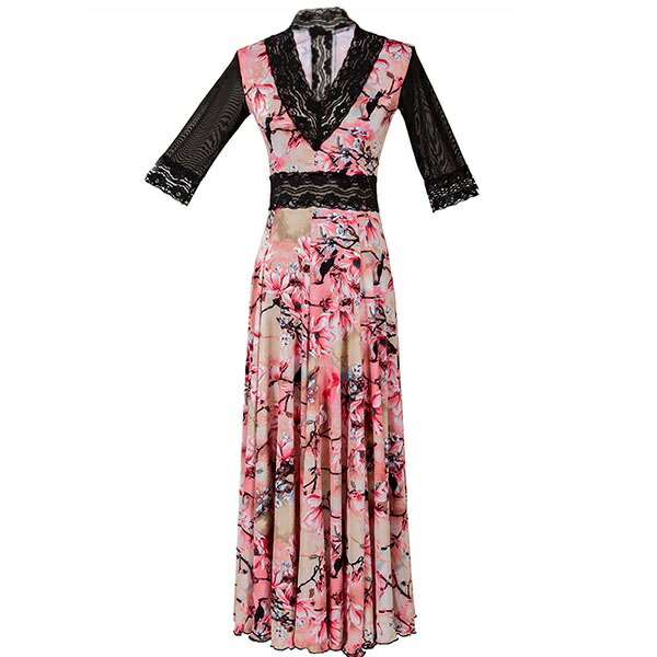 社交ダンス ドレス 社交ダンス衣装 ワンピース Vネック 開場ドレス 花柄 7分袖 豪華 スタンダードドレス ワルツ タンゴ モダン 競技ダンス 発表会用 スタイリッシュ ダンスウェア レッ カラフル