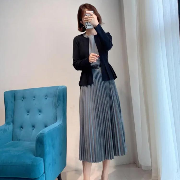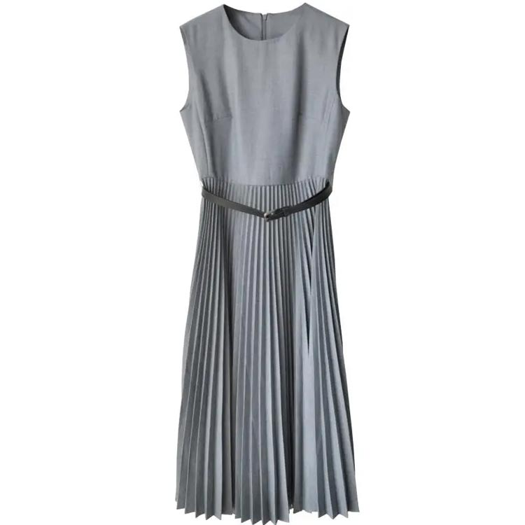 細かいプリーツと高め位置の切り替えによる縦長効果でスタイルアップも叶う。