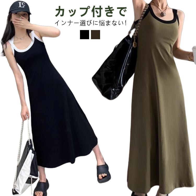 カップ付き ワンピ 夏 ノースリーブ レディース 春 ワンピース 秋 Aライン ダブルストラップ ロングワンピース タンクワンピ ルームワンピース 抜け感 カジュアル キャミワンピ 大人