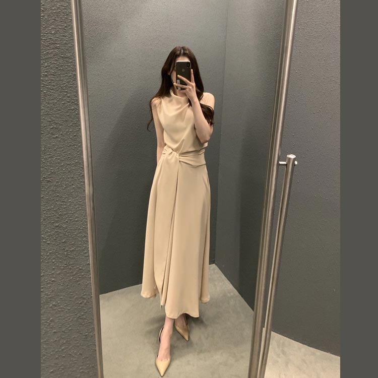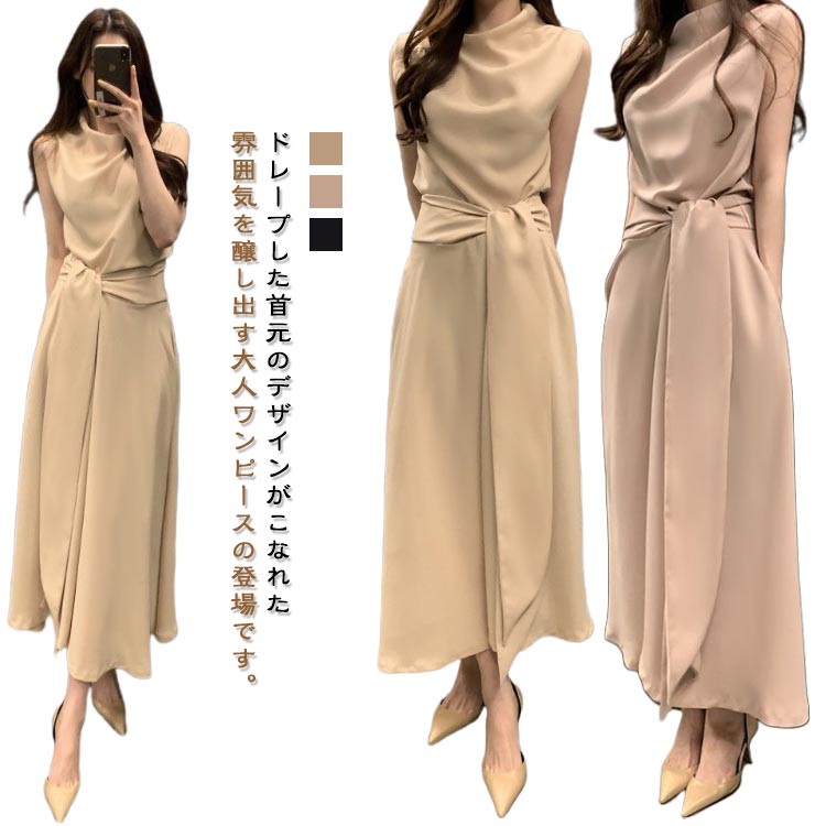 上品 ドレープネック ワンピース ロングワンピ ウエストタイ ミディ丈 ロング丈 ロングワンピース 夏 ロング 無地 レディース シック お呼ばれ 大人 オフィス カジュアル フェミニン