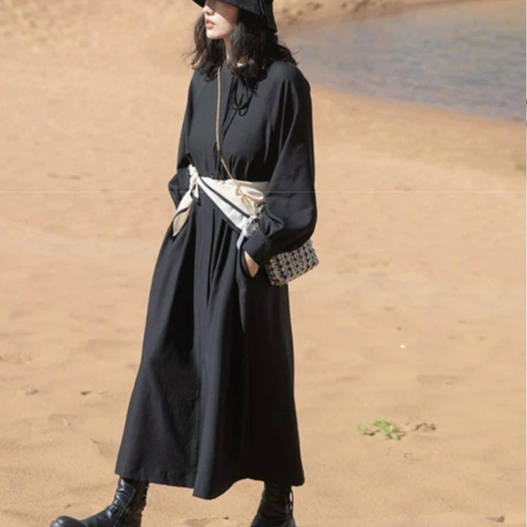 ワンピース レディース シャツワンピース ウエストリボン プルオーバー 通勤 ロングワンピ ラウンドネック OL 長袖 ワンピ ロングワンピース シャツ袖 体型カバー 着痩せ おしゃ 無地