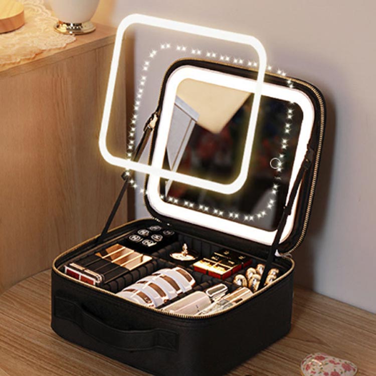 【サイズ】ボックス:260mm*230mm*100mmミラー:236mm*206mm*120mm重さ:約1.2kgバッテリー容量:800/2000mAh【商品内容】・メイクボックス本体×1・ブラシ収納袋×1・仕切り板×6(大1枚、中2枚、小3枚)・USB充電コード×1※商品のサイズは手作業で測定させて頂いておりますので、若干の誤差があります。