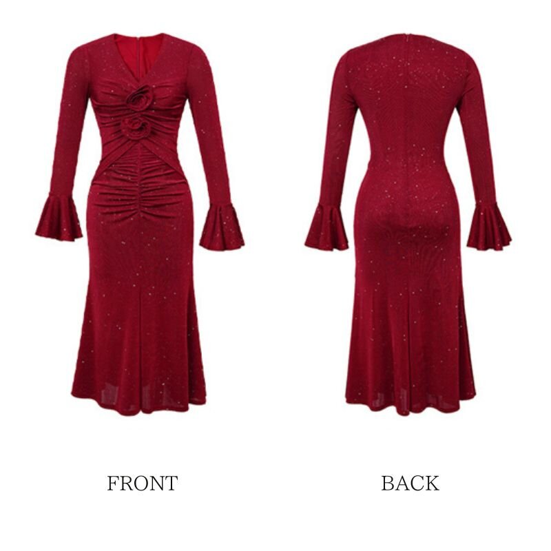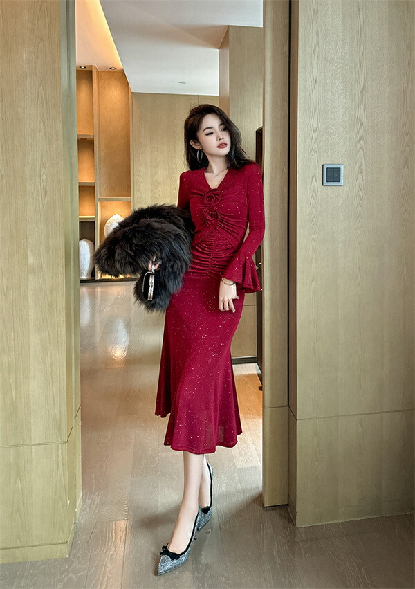 フラワーモチーフとスパンコールが特徴のワインレッドのタイトフィットロングワンピースパーティードレスエレガント フェミニンレディース韓国 ファッションam5552