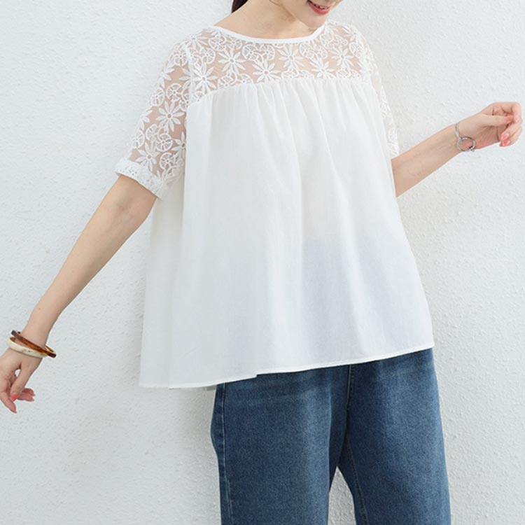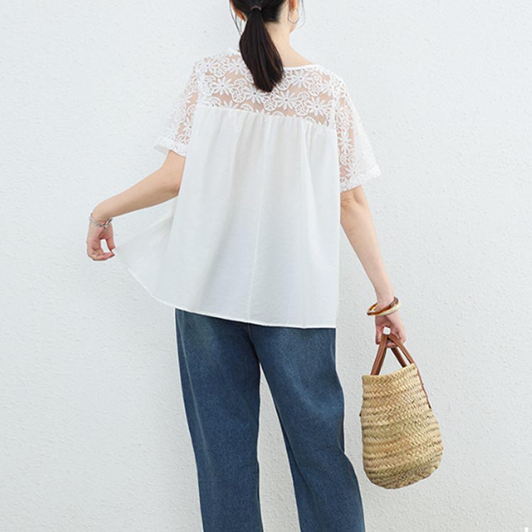 女性らしさが溢れる切替レースTシャツ S-2XL