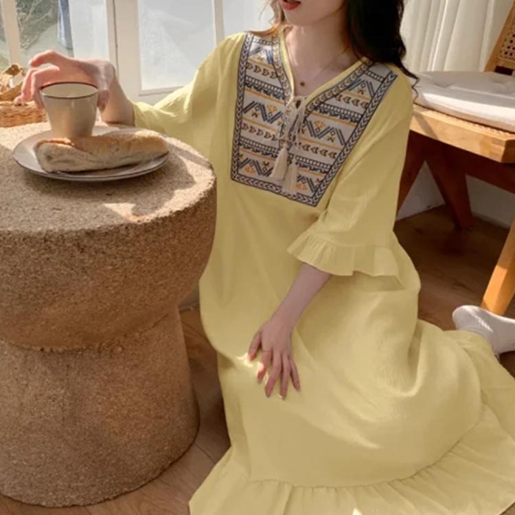 ルームウェア 5分袖 可愛い 刺繍 ワンピース 部屋着 半袖 大きいサイズ ロング レディース ルームワンピース パジャマ 綿 ナイトウェア 夏 フリル コットン 寝間着 リラックス ワンマイ 涼しい