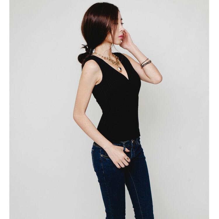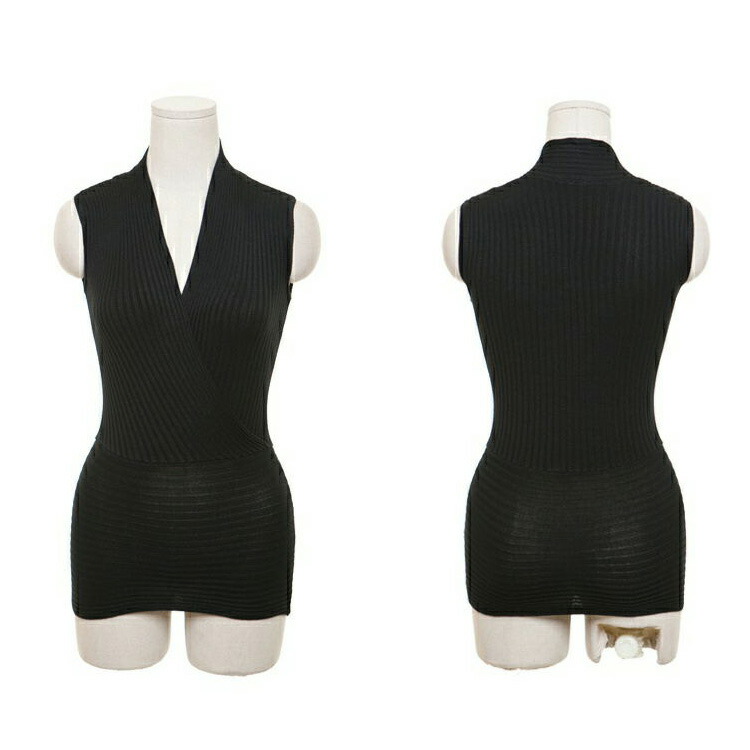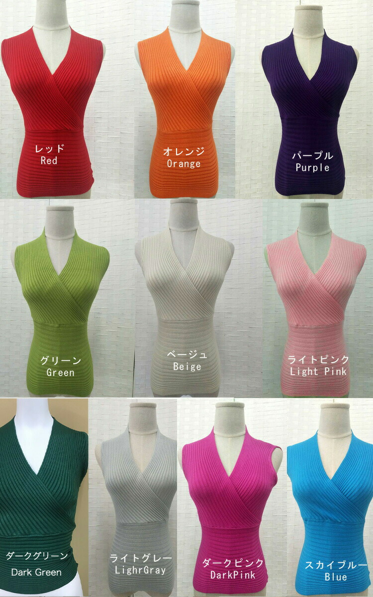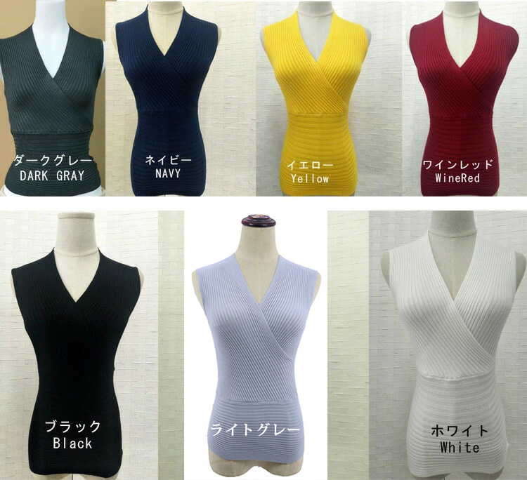ノースリーブ ニット トップス ショート丈 全17色 かっこいい ニット リブニット カシュクール Vネック F フリーサイズ レディース ブラック ホワイト