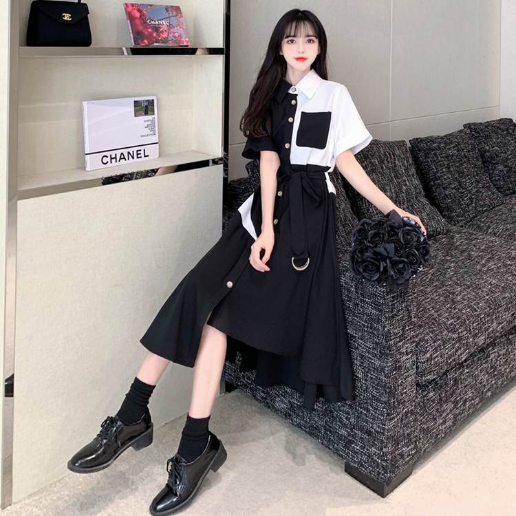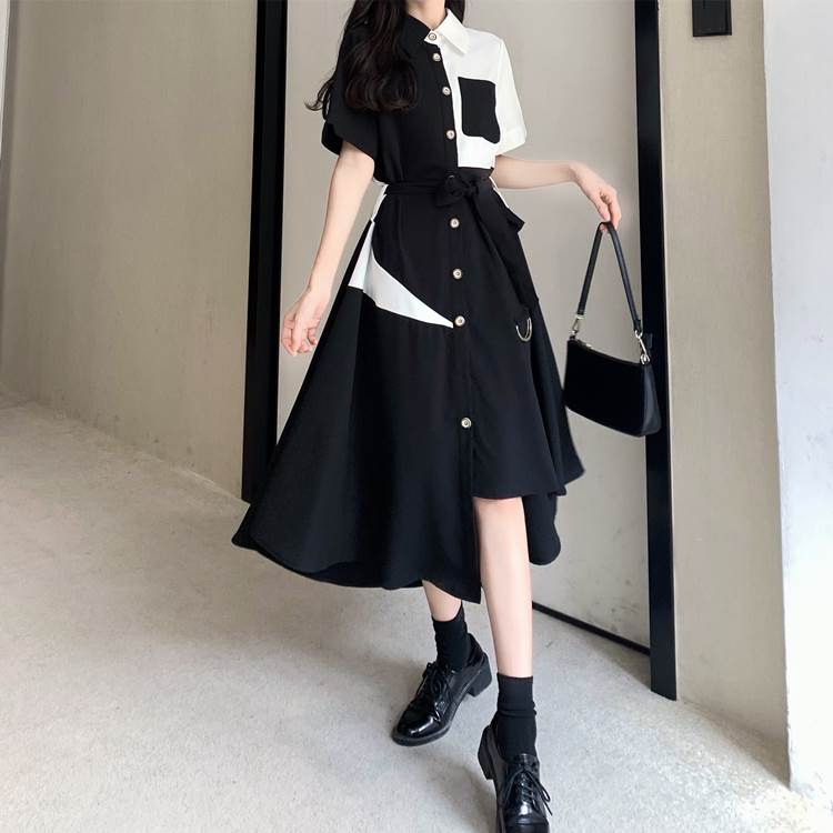 ワンピース レディース シャツワンピース ミディアム丈 ロング丈 袖あり 半袖 フレア Aライン 切り替えデザイン アシンメトリー ドッキング ウエストマーク ウエストベルト ウエストリボン きれいめ 上品 おしゃれ お洒落 かっこいい 個性的 主役級 存在感 M L XL 2XL 3XL 4XL 大きいサイズ ブラック ホワイト 黒 白 モノトーン バイカラー 夏 10代 20代 30代 40代 デート お出かけ 休日 パーティー イベント