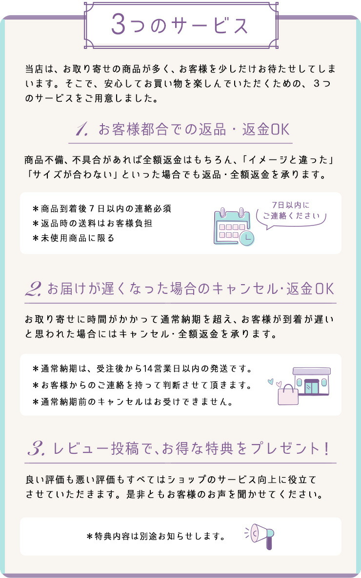 欠品や商品の不具合などにより、商品をお届けすることができず、ご注文をキャンセルさせていただく場合もございますのでご了承ください。
