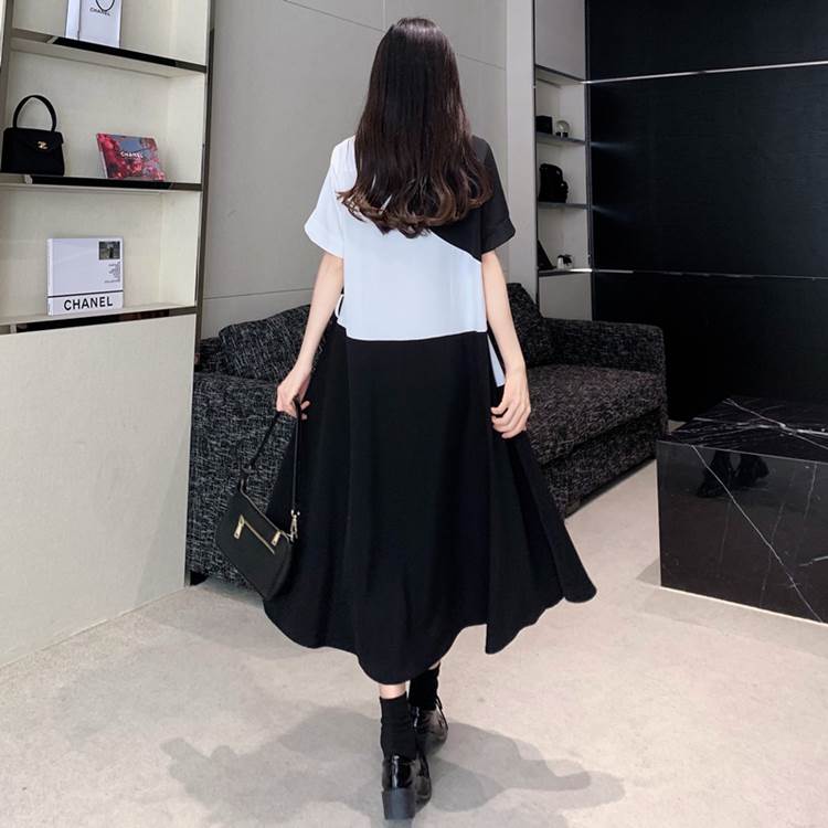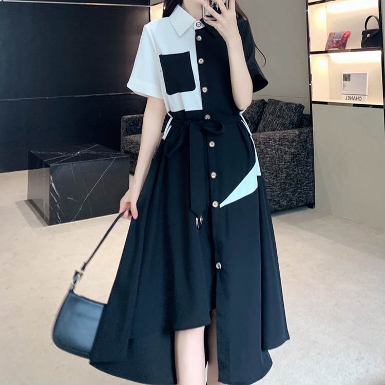 ワンピース レディース シャツ 個性的 半袖 襟付き ひざ丈 ミモレ丈 バイカラー ドッキング アシメントリー モノトーン 黒 M L XL 2XL 3XL 4XL 大きいサイズ 春 夏 秋 きれいめ