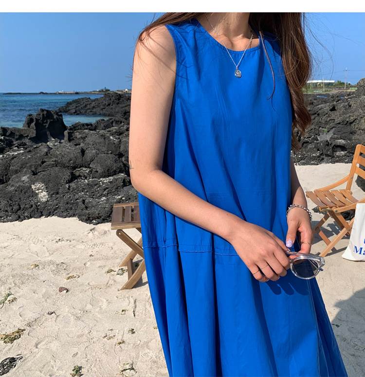 ティアード レディース ロング ワンピース ノースリーブ マキシ ラウンドネック フレア Aライン ロイヤルブルー 青 綿 かわいい 大人 きれいめ シンプル カジュアル おしゃれ こなれ感