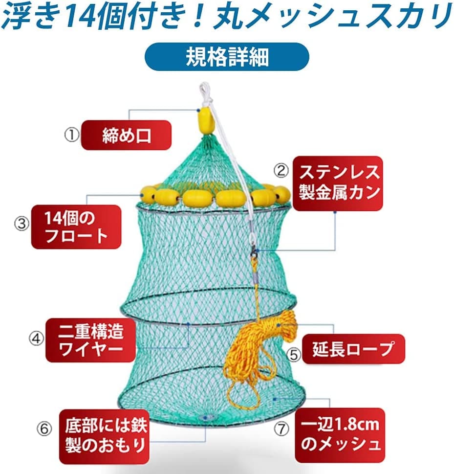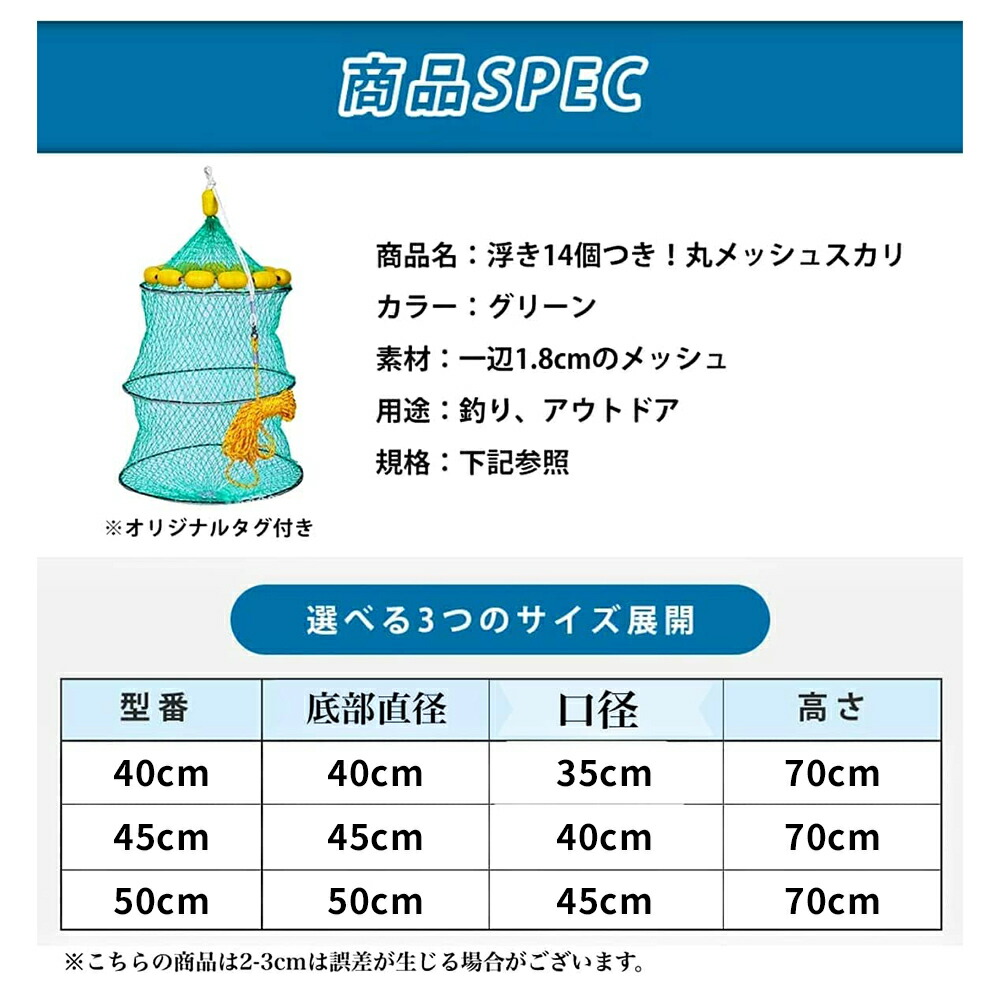 スカリはメッシュになっている為、エサバケットや小物類、使ったルアーなどをスカリに入れて海に投げ込み浮かべておけば仮洗いができます。小さいバケツを仮洗いする場合はスカリに入れて余裕のあるものにしましょう。 ※仮洗いのままでは海水で錆びてしまう可能性がある為、帰ってからは真水で丁寧に洗う事をおすすめします。商品仕様 ●スペック:直径35cm、直径40cm、直径45cm(3種類)