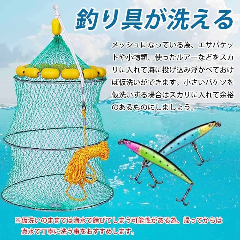 スカリはメッシュになっている為、エサバケットや小物類、使ったルアーなどをスカリに入れて海に投げ込み浮かべておけば仮洗いができます。小さいバケツを仮洗いする場合はスカリに入れて余裕のあるものにしましょう。 ※仮洗いのままでは海水で錆びてしまう可能性がある為、帰ってからは真水で丁寧に洗う事をおすすめします。