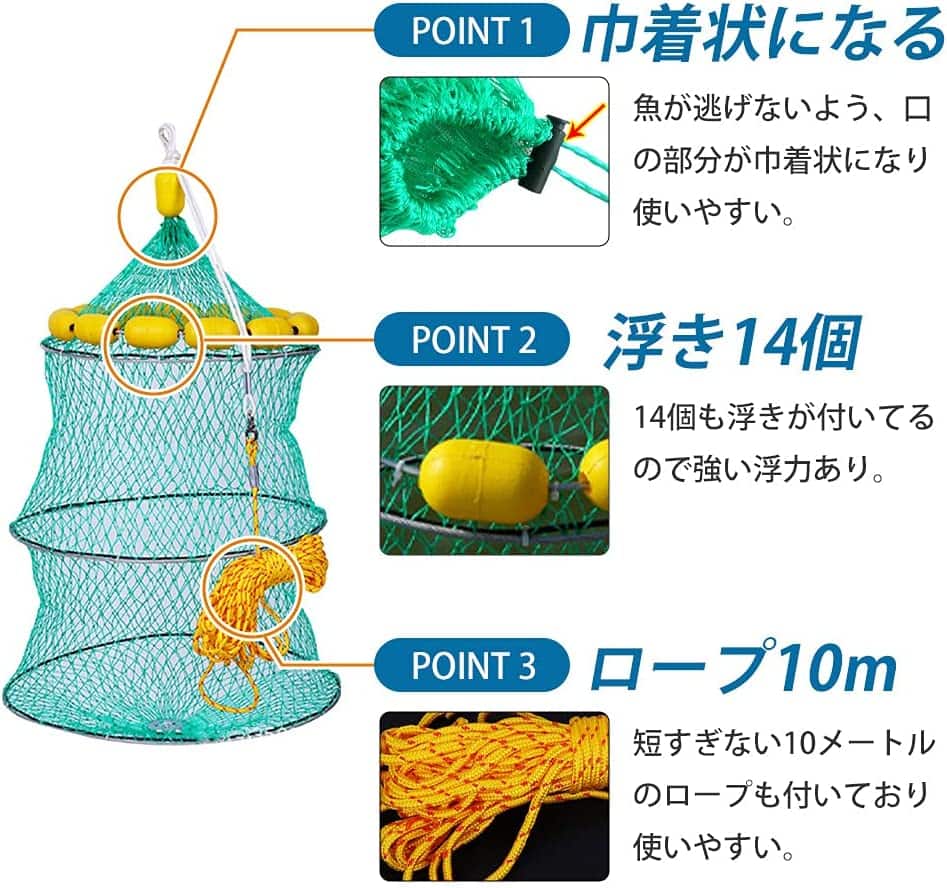 網目から魚が逃げないように、網の先端の口の部分が巾着状になり使いやすさはバツグンです。堤防から釣った魚を活かしておくには最適です。釣った魚を直接入れるか玉網(たも網)を使ってお入れください。