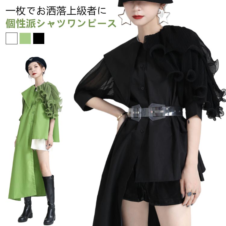 レディース 春 白 ボリューム 長袖 クール フリル アシメ シャツワンピース ワンピ パフスリーブ アシンメトリー シャツ ゆったり 襟付き ドッキング 個性的 コート 韓国 秋 冬 ワンピー 綿混