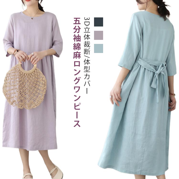 ロングワンピース ゆったり 半袖 大人可愛い 7分袖 綿麻 着痩せ 春 夏 ネイビー パープル ライトブルー