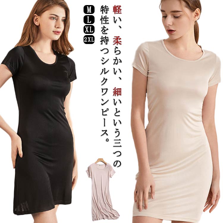 スリップ シルク ワンピース インナー 半袖 肌着 伸縮性 保湿 ショート丈