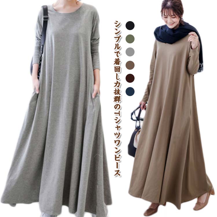 ロング レディース ワンピース きれいめ 長袖 マキシ丈 tシャツ tシャツワンピース ロング丈 カットソー コットン フレア ロングワンピース Aライン マキシワンピース 体 ルームウェア
