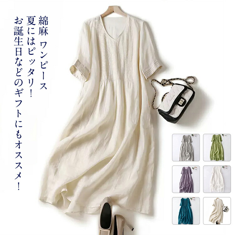綿麻ワンピ ワンピース ミドル丈ワンピース 半袖 レディース 女性 学生 大人 きれい シンプル ファッション おしゃれ プレゼント 誕生日 ギフト 通勤 オフェンス OL 通気 薄手 着 お出かけ