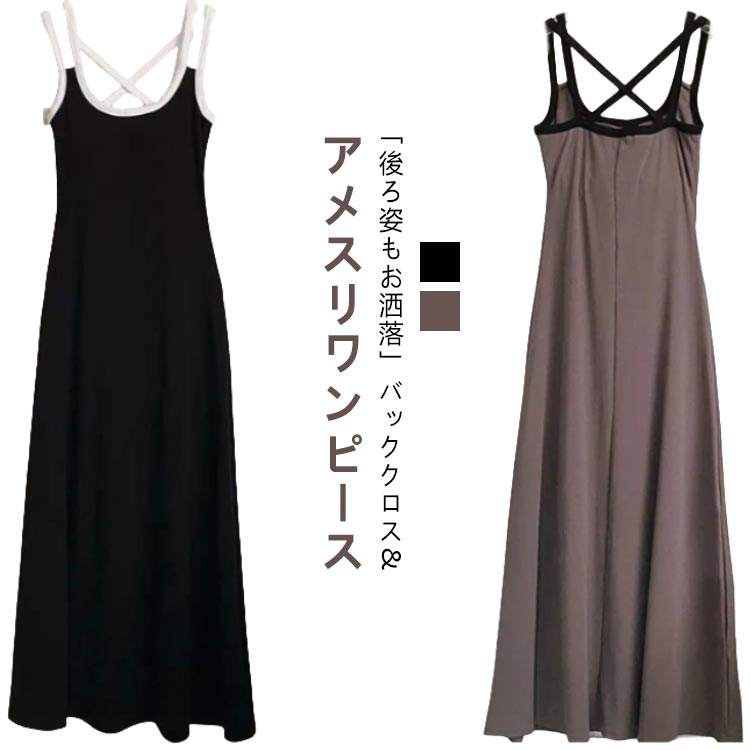 ワンピ バッククロス カップ付き タンクトップ Aライン 春 夏 大人 アメリカンスリーブ レディース キャミソール ワンピース キャミワンピ ロング 秋 抜け感 カジュアル ノースリーブ
