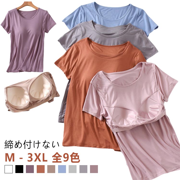 カップ付きTシャツ ブラ付き 夏 インナー 大きいサイズ 部屋着 カップ付き Tシャツ 前のみ ルームウェア レディース ゆったり 締め付けない ブラトップ 無地 カットソー 半袖Tシャツ ナイ 半袖