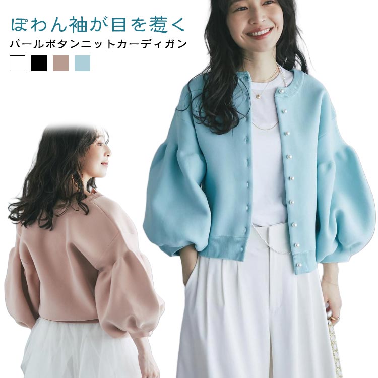 優しい印象に見せてくれるあたたかな着心地でお洒落に活躍します。ぽわん袖が目を惹くパールボタンニットカーディガン ボリューム袖 セーター