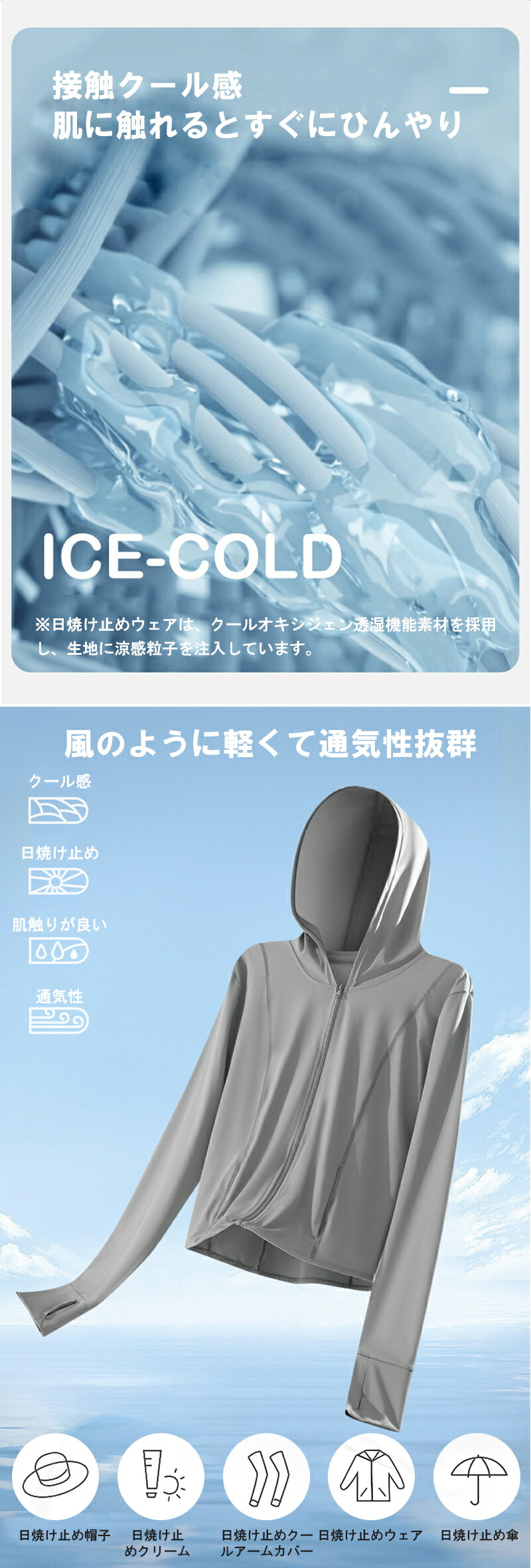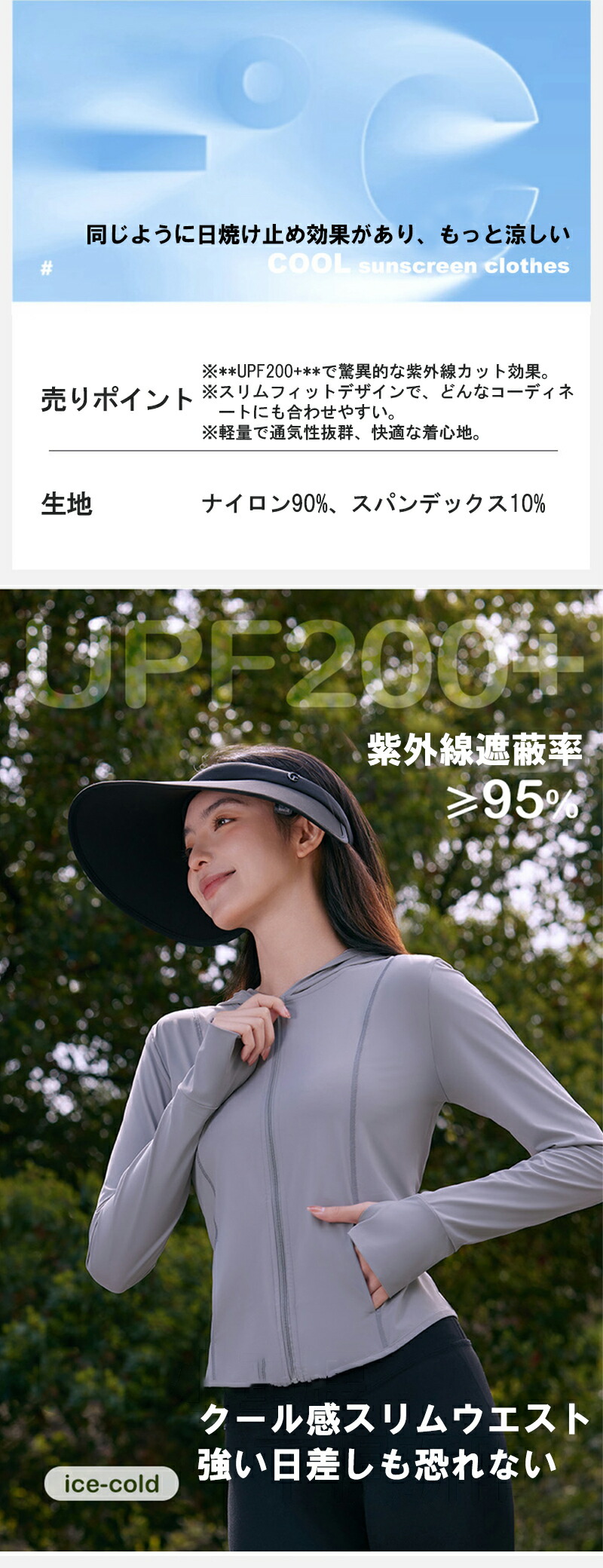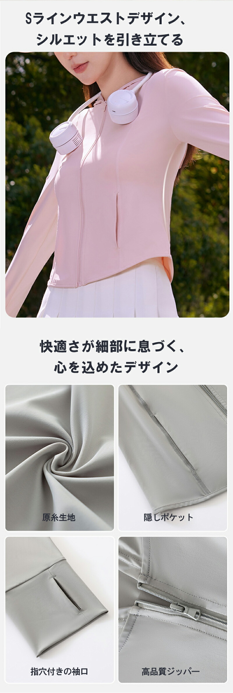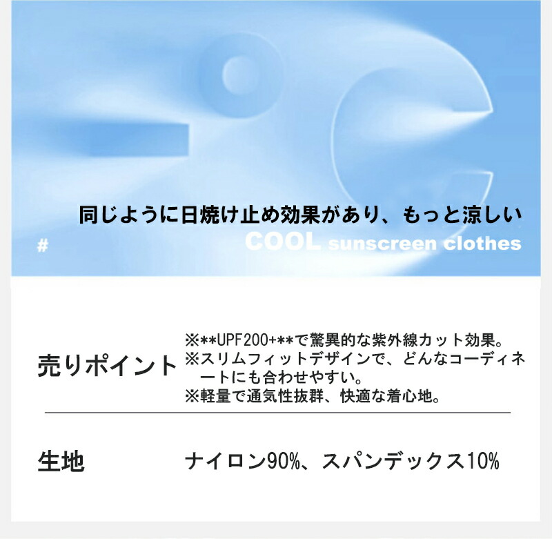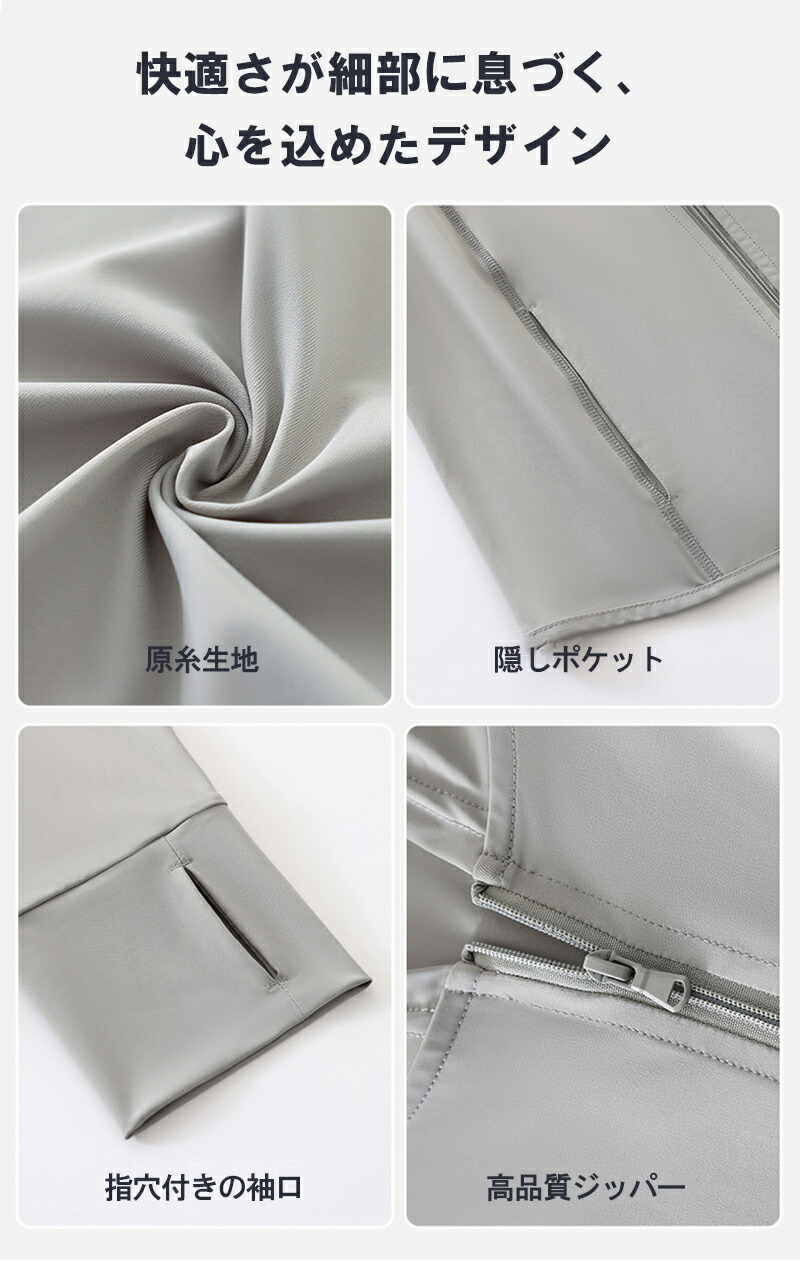 機能特性 接触冷感、紫外線対策、軽量、スリムシルエット、調節可能フード、指穴付き袖口