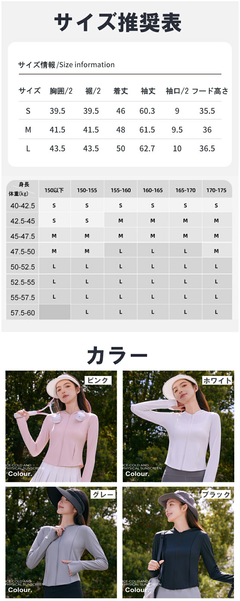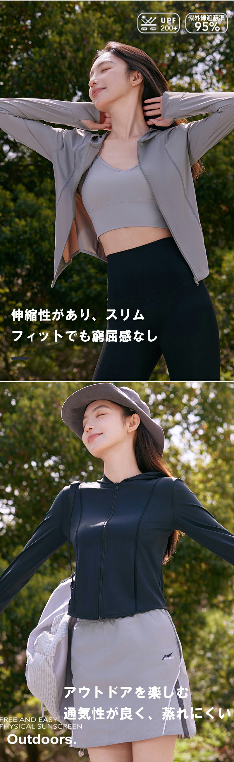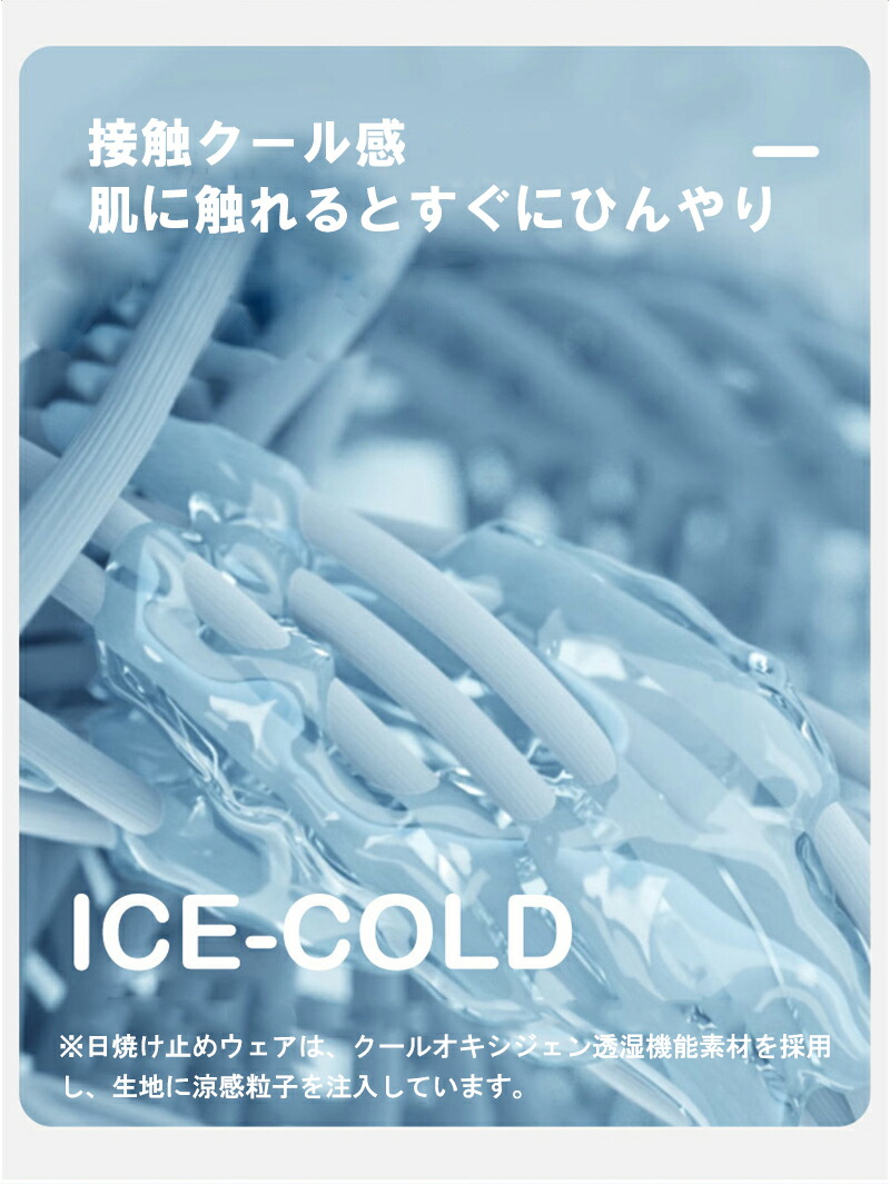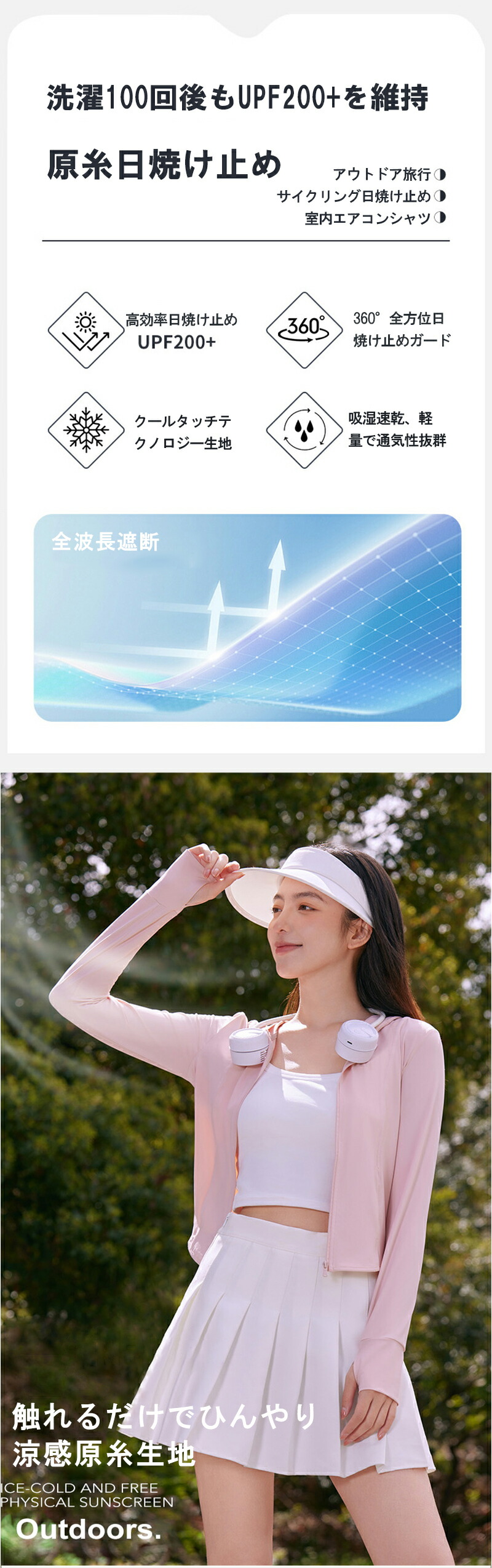 機能特性 接触冷感、紫外線対策、軽量、スリムシルエット、調節可能フード、指穴付き袖口