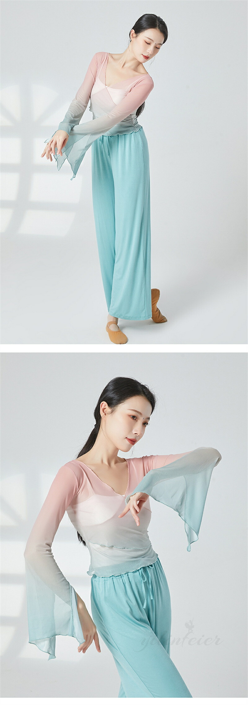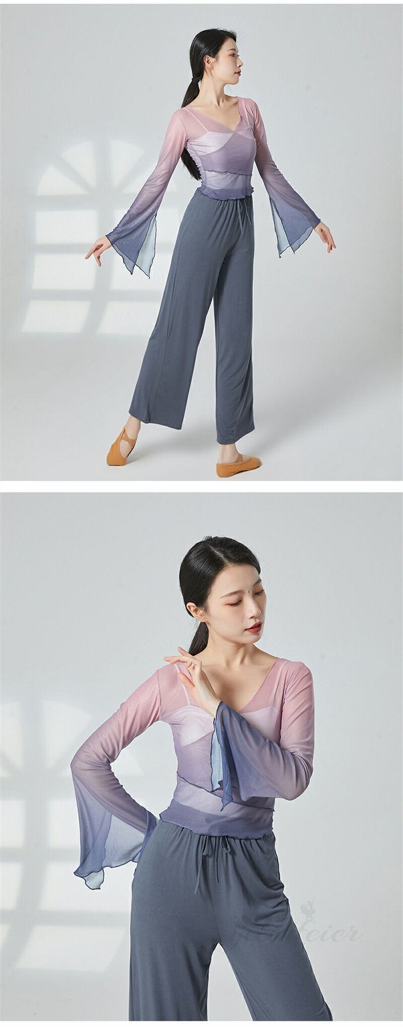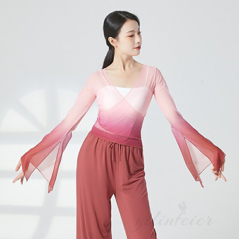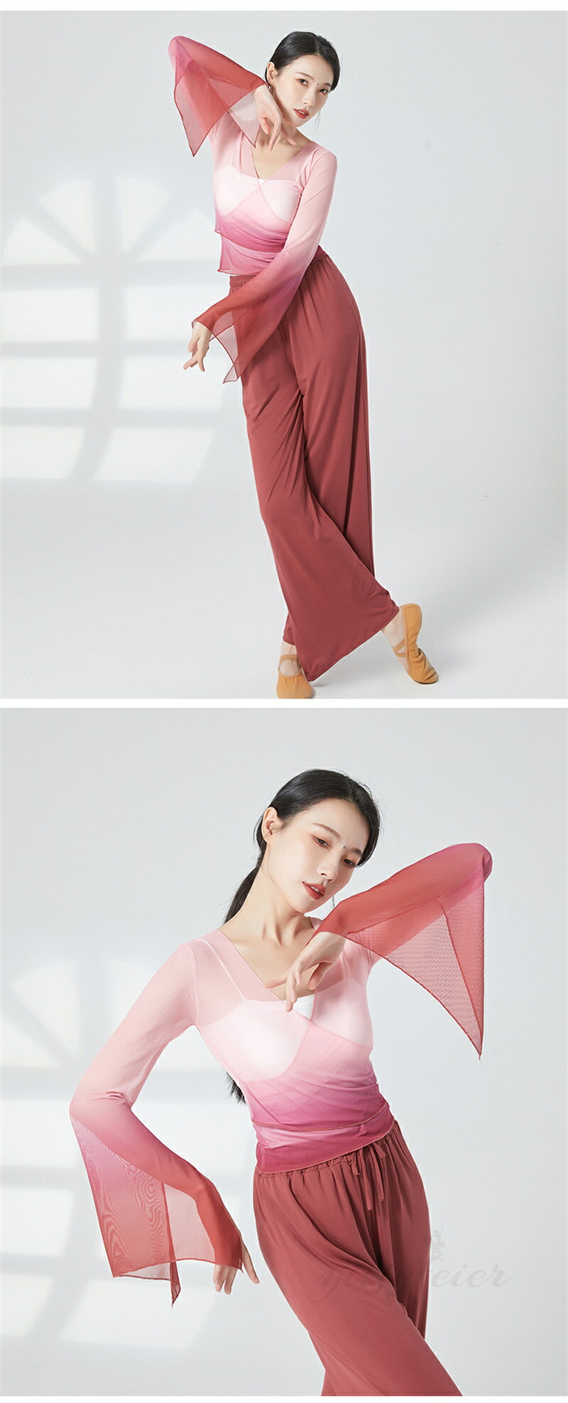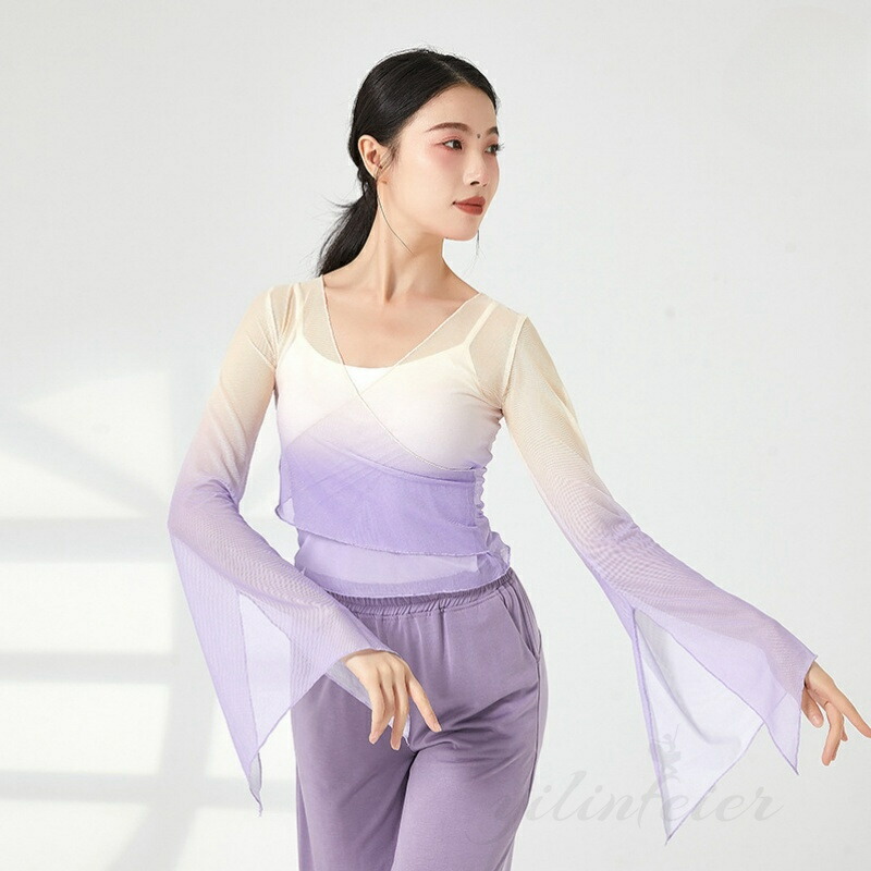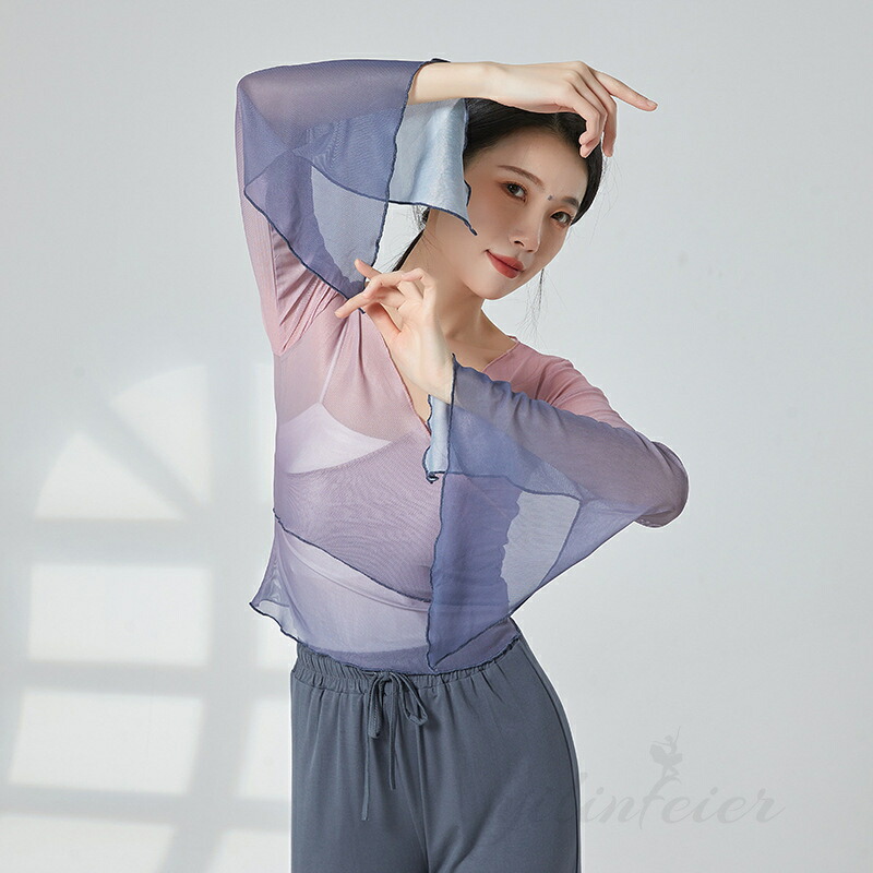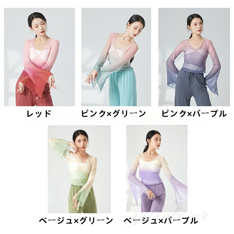 ★V ネックは適度な深さで、首元をすっきりと見せ、女性の凛とした雰囲気を引き立てます。クロスの交差デザインは、ボディー部分に立体感を与え、ダンサーの曲線美を強調します。フレアースリーブは、動きに合わせて美しく揺れ、ダンサーの動きを一層魅力的に見せます。そして、グラデーションの色合いは、独特で他にはない存在感を放ちます。