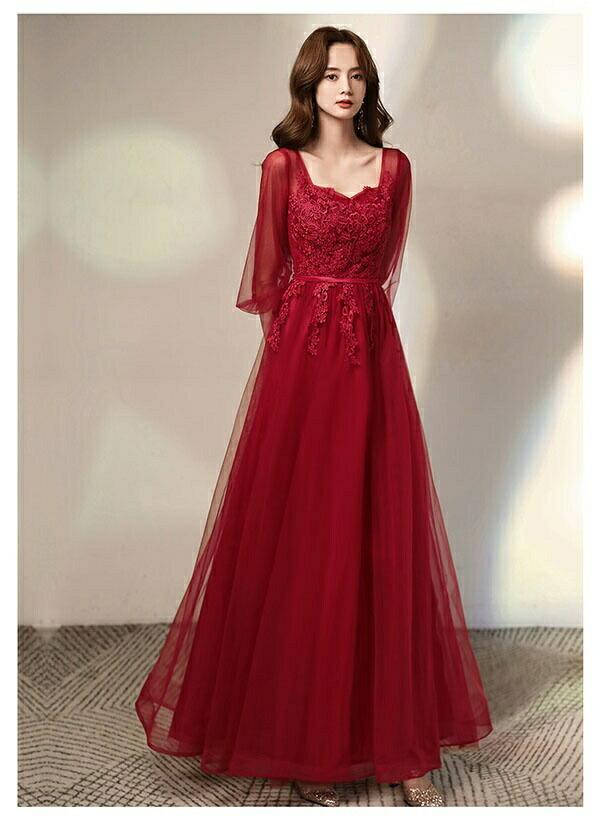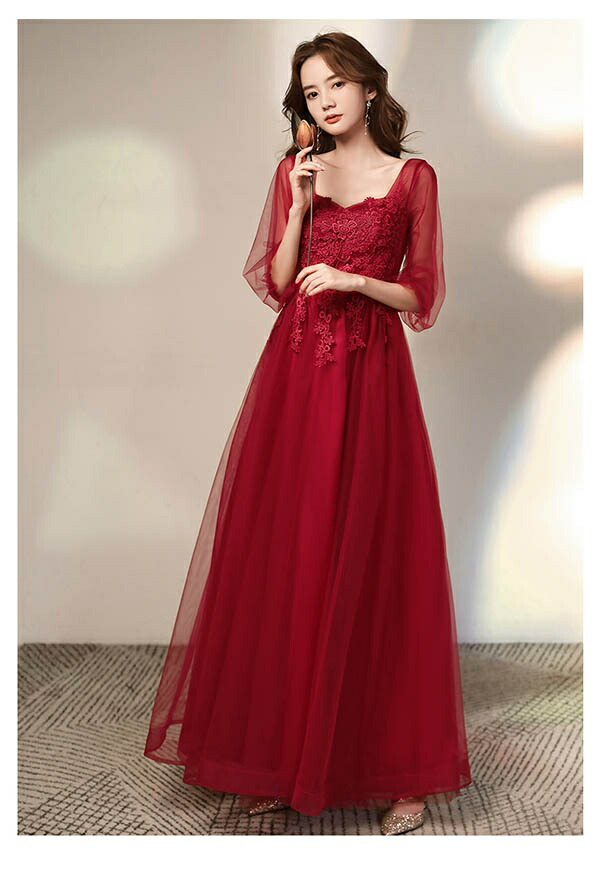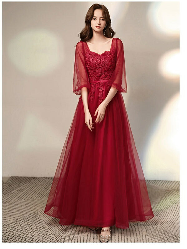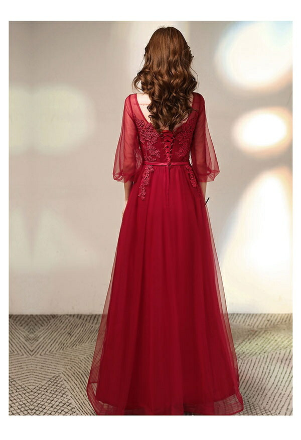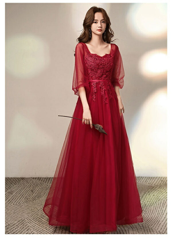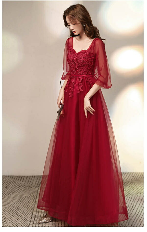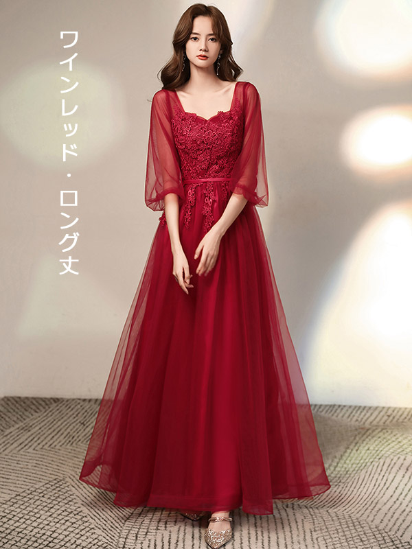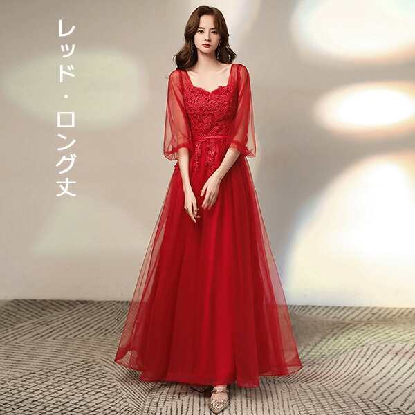 レディース 大人 ピアノ発表会 ロングドレス 赤(レッド) Aライン 五分袖シアー 大きいサイズ 結婚式/二次会用 ステージドレス 20代-40代 フェミニン