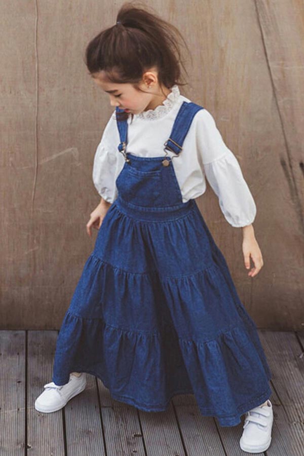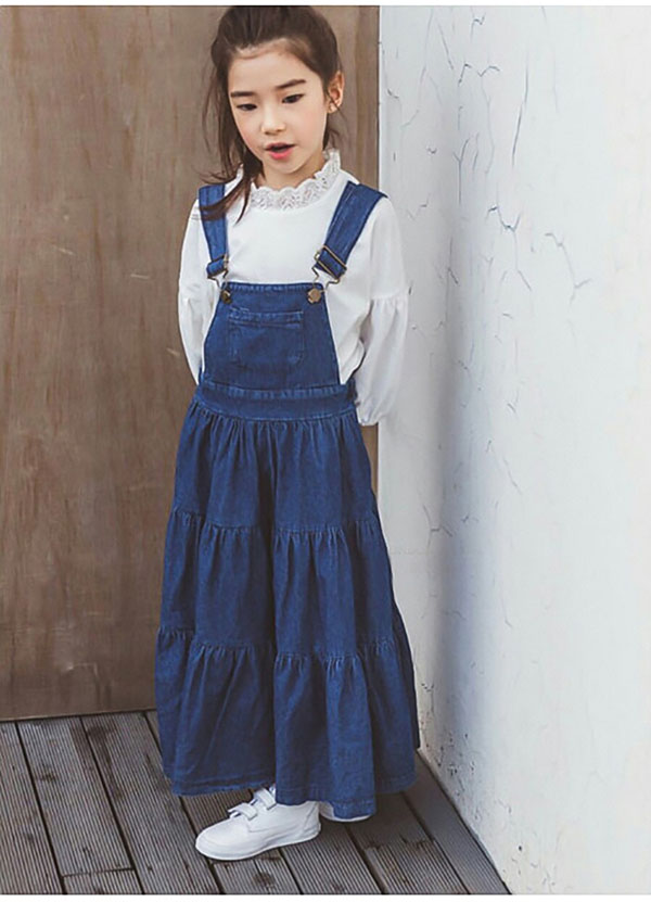 韓国風デニムワンピース 子ども服 春秋新作 サスペンダースカート ロング丈 女の子 通園 通学 お出かけ用 幼児 小学生対応
