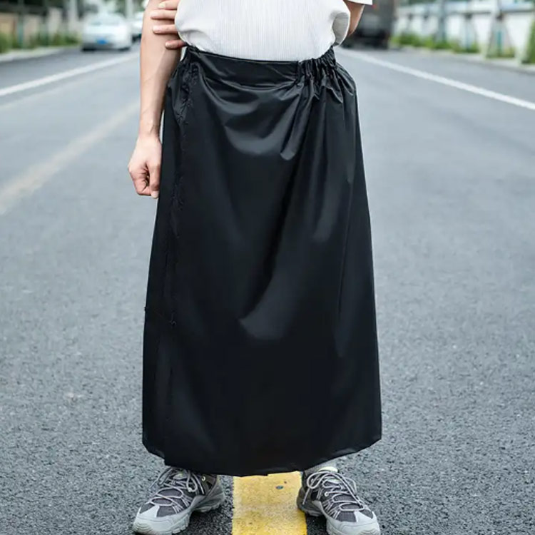 ウエストゴムで着脱しやすいレイン巻きスカート。