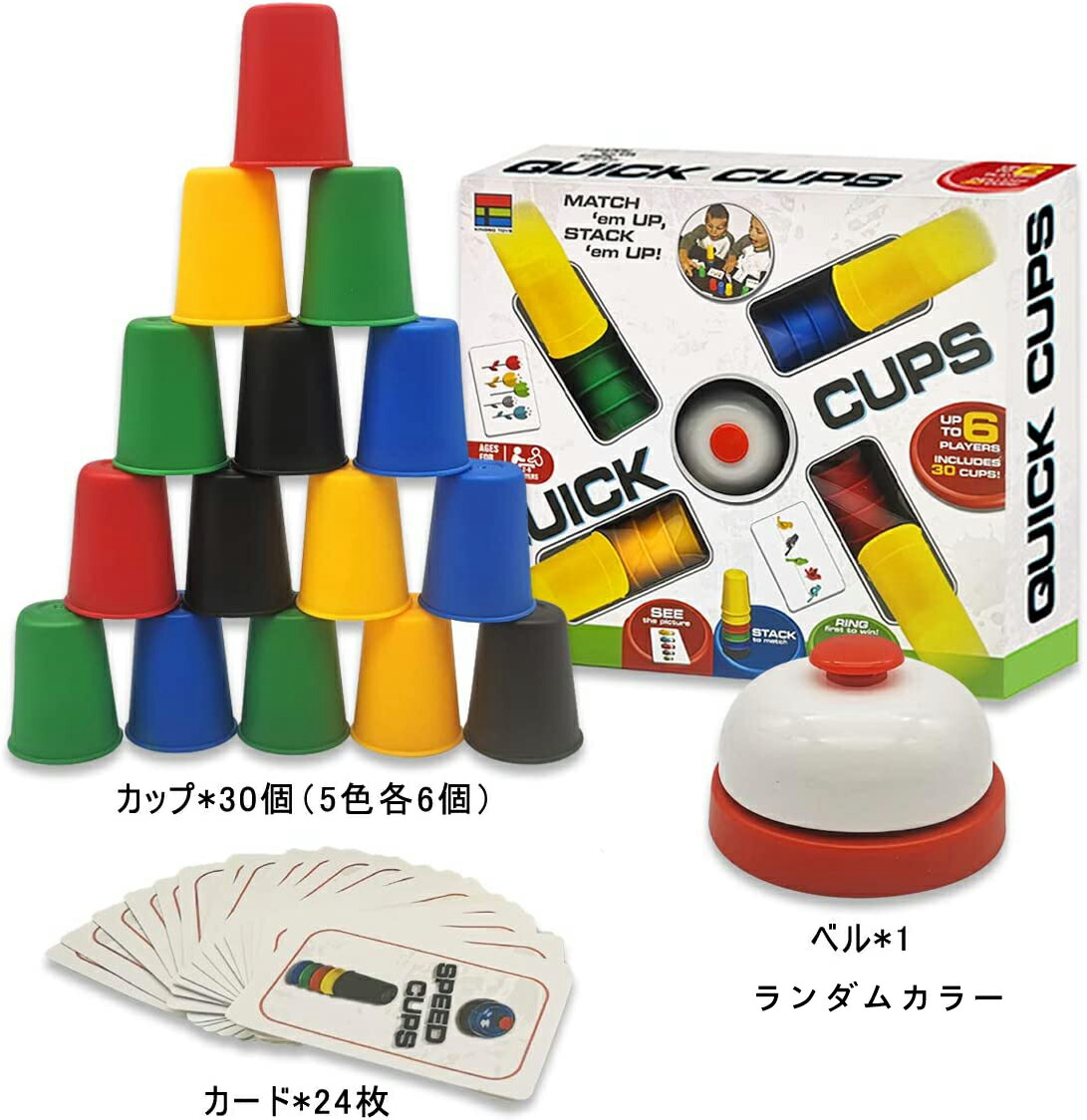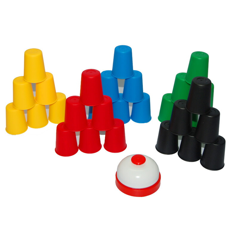 "【イベントの定番】:ベルを叩き、スピードカップというのは、カードの5色のアイテムによって、順番にカップを積み重ねたり、並べたり、面白くて簡単なゲームです。カップは青、赤、緑、黄、黒その5種類の色があります。カラフルな色で子供の遊び興味を刺激し、男の子も女の子も大喜びです。クリスマスや誕生日などのイベントでも大活躍です。