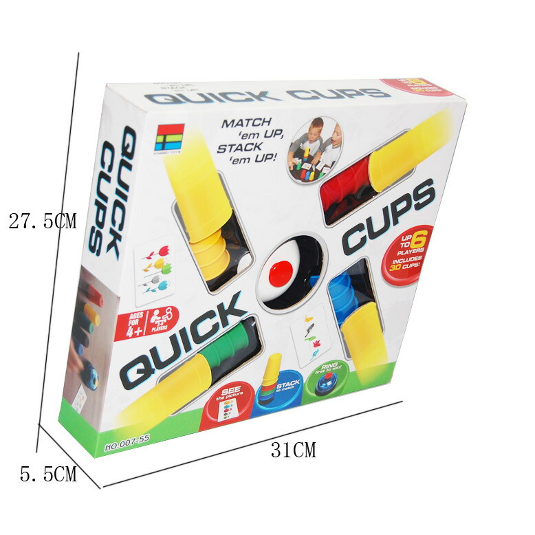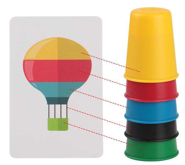 【面白いカップゲーム】:スピードカップスカードには5色のアイテムを描きます。カードの絵は横一列に並んでいる場合と、上下に分かれている場合があります。それぞれの場合によって、カップを並べるか積み重ねるかを判断しなければなりません。子供は見たものをちゃんと考えて、思考能力を発達させます。