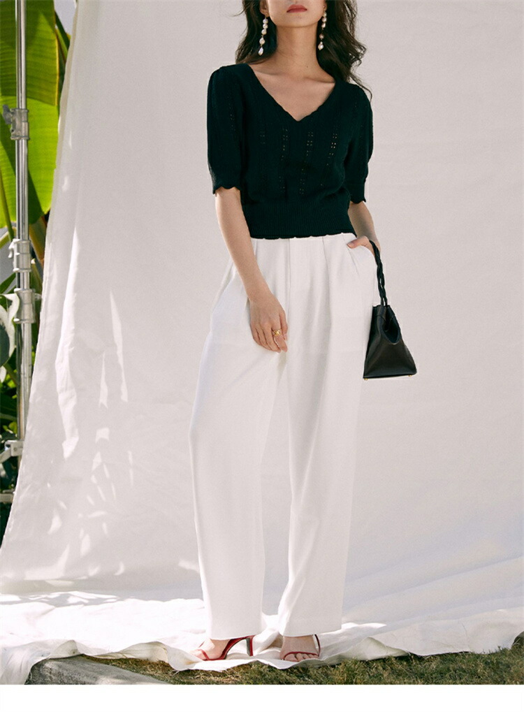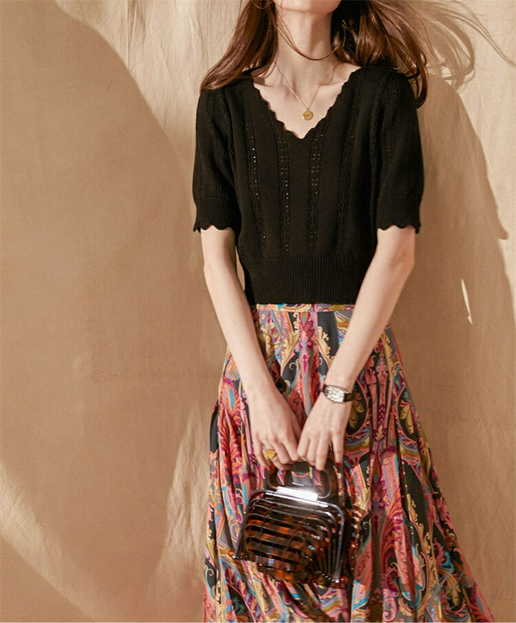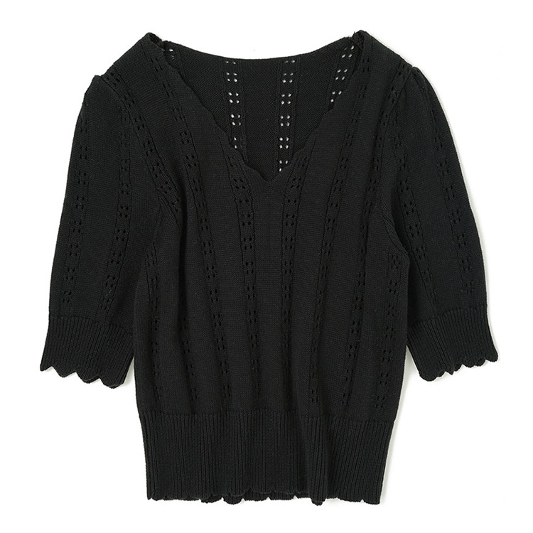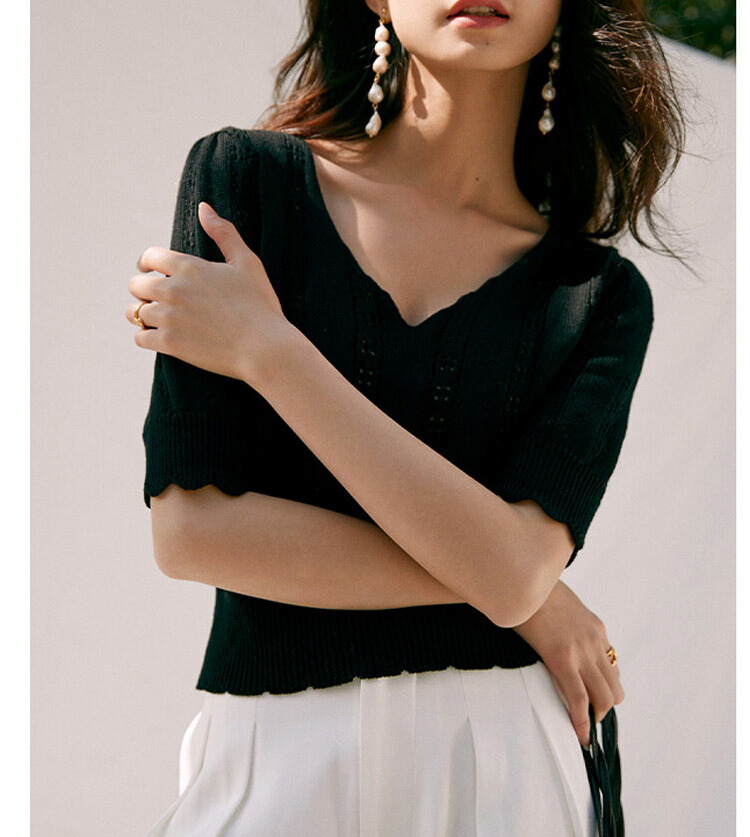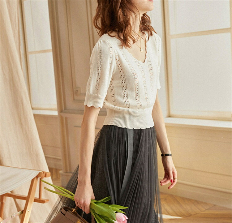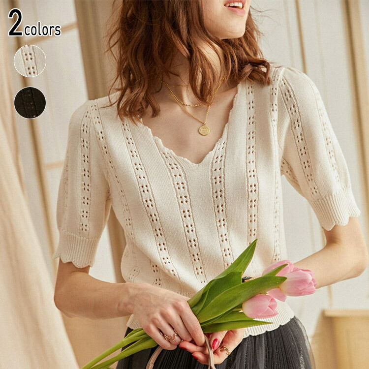 ニット カットソー 透かし編み 半袖 Vネック トップス レディース 春 夏 シースルー プルオーバー サマーニット きれいめ おしゃれ ホワイト ブラック カジュアル 体型カバー 韓国ファ シンプル