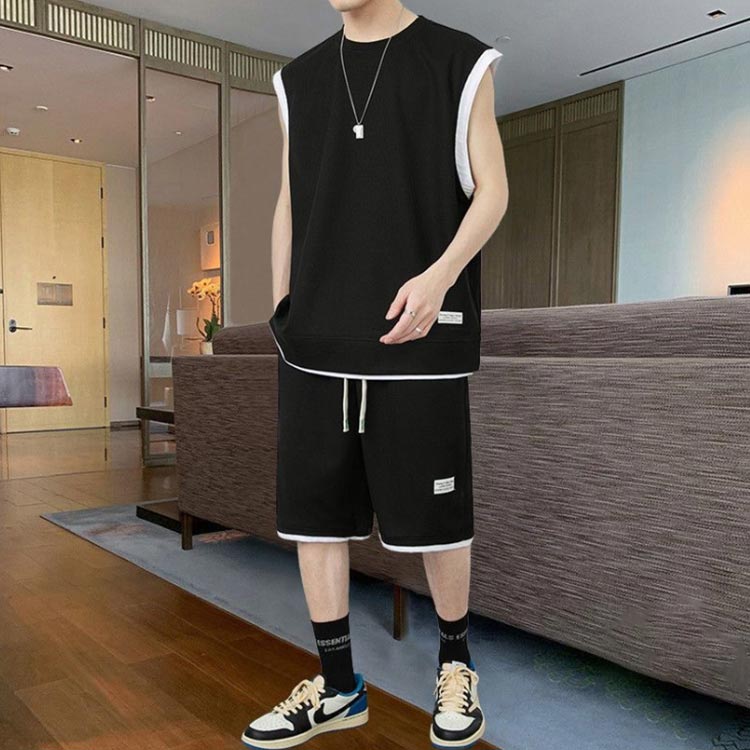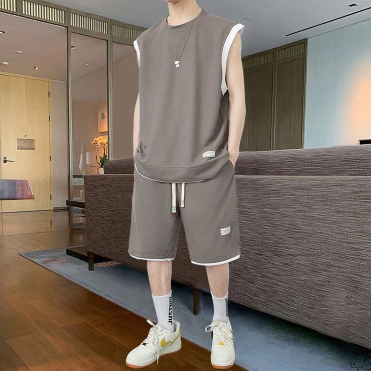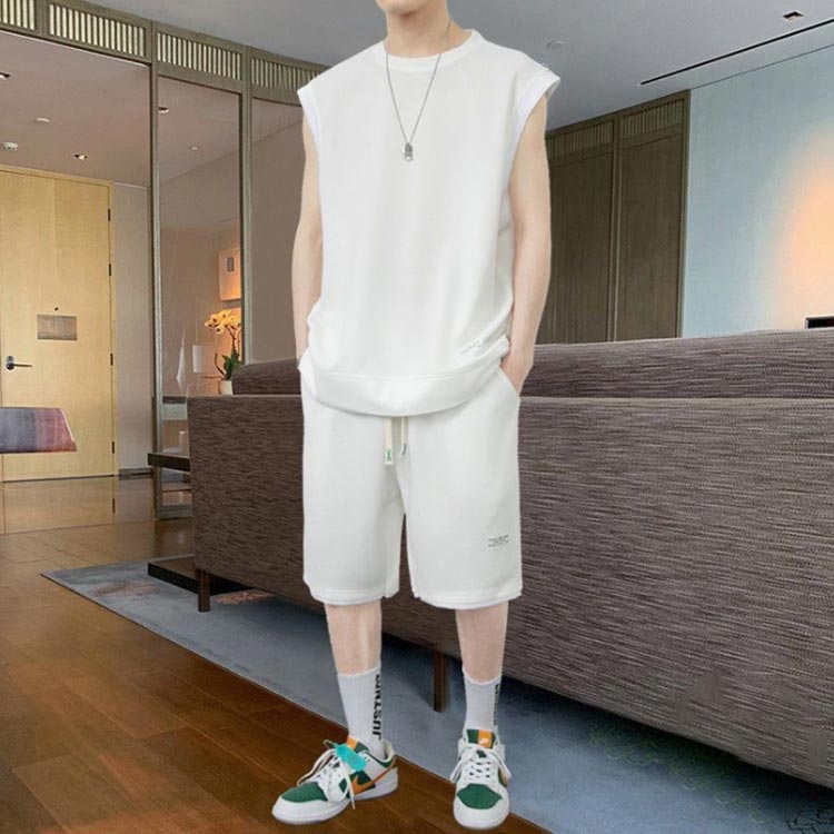 ハーフパンツ 上下セット ワッフル生地 サルエルパンツ トップス ベスト セットアップ カットソー tシャツ トレーナー ノースリーブ メンズ 通気性 ズボン 春夏 ジャージ