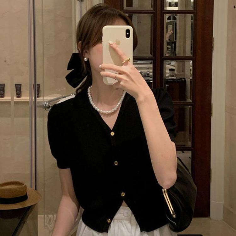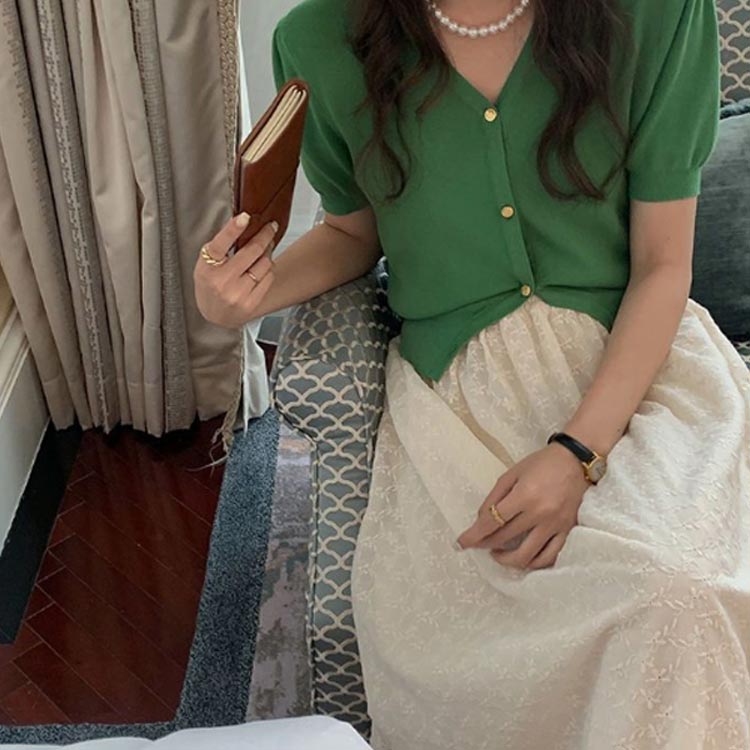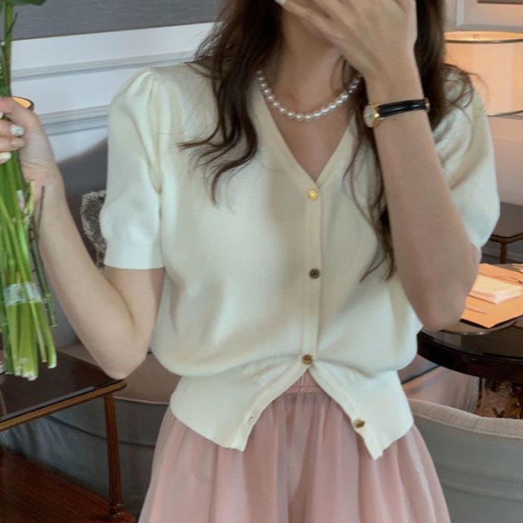 Vネックデザインが女性らしさを引き立て、スタイリングにアクセントを。韓国人気の前ボタンのサマーニットです。