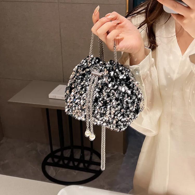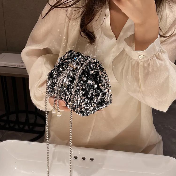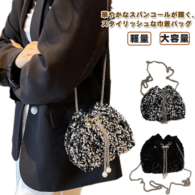 スパンコール 大容量 巾着バッグ ミニ バッグ レディースバッグ ショルダーバッグ メッセンジャーバッグ 新作 ブラック シルバー