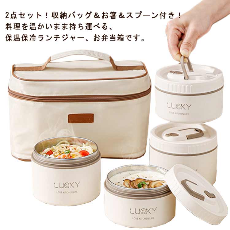 2点セット!収納バッグ&お箸&スプーン付き!料理を温かいまま持ち運べる、保温保冷ランチジャー、お弁当箱です。