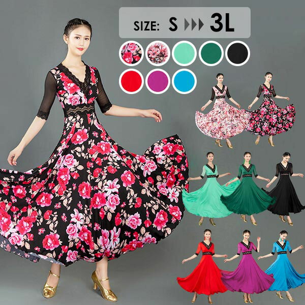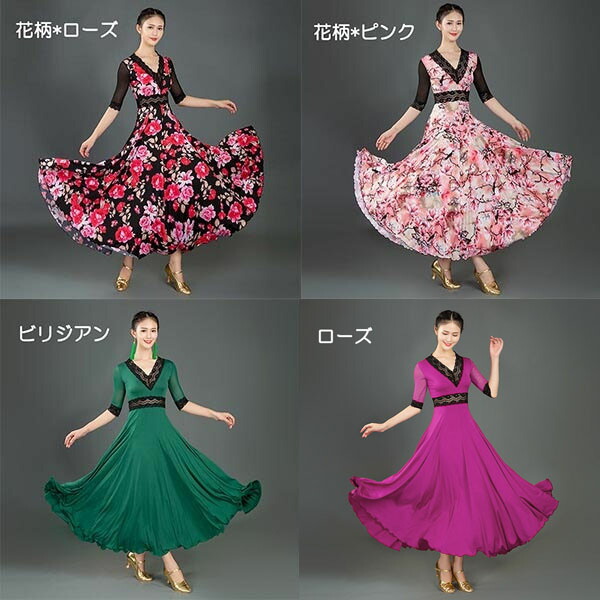 社交ダンス ドレス 社交ダンス衣装 ワ レディースファッション 新登場! S M L 2L(XL) 3L(2XL) 花柄*ローズ 花柄*ピンク レッド ビリジアン ブラック ブルー ミントグリーン ローズ