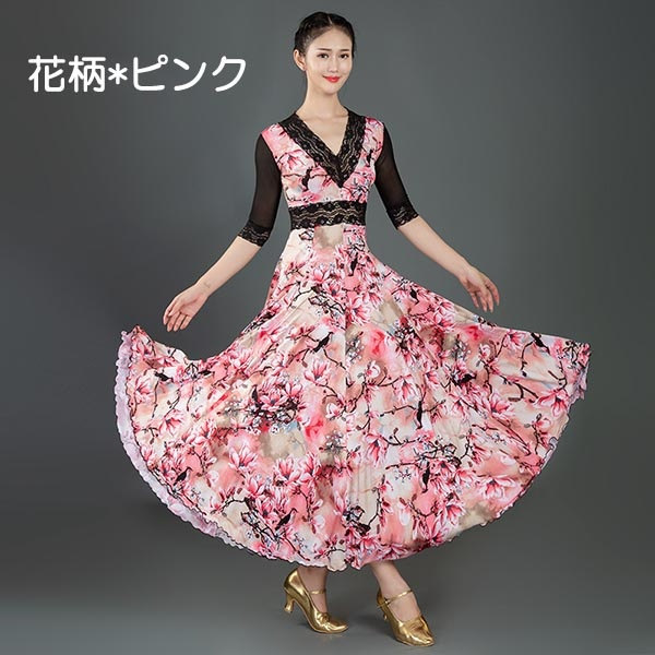 社交ダンス ドレス 社交ダンス衣装 ワンピース Vネック 開場ドレス 花柄 7分袖 豪華 スタンダードドレス ワルツ タンゴ モダン 競技ダンス 発表会用 スタイリッシュ ダンスウェア レッ カラフル