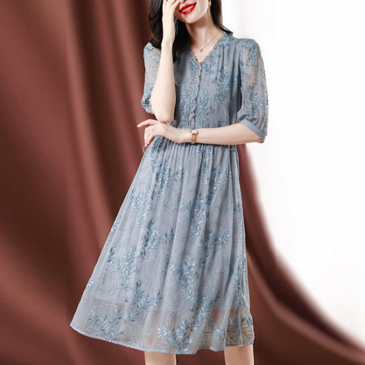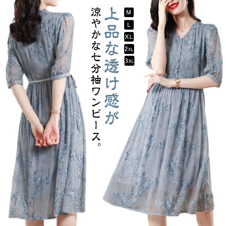 ワンピース 花柄 七分袖 シルク混 透 レディースファッション 超目玉商品 M L XL 2XL 3XL