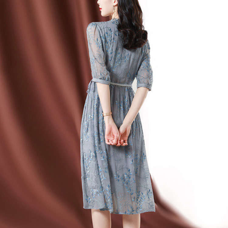 ワンピース 花柄 七分袖 シルク混 透け感 カジュアル レディース フラワー エレガント ドレス きれいめ ボタニカル 袖あり 青 可愛い フェミニン ミモレ丈 Aライン ロング丈 ウエストリボ 大人
