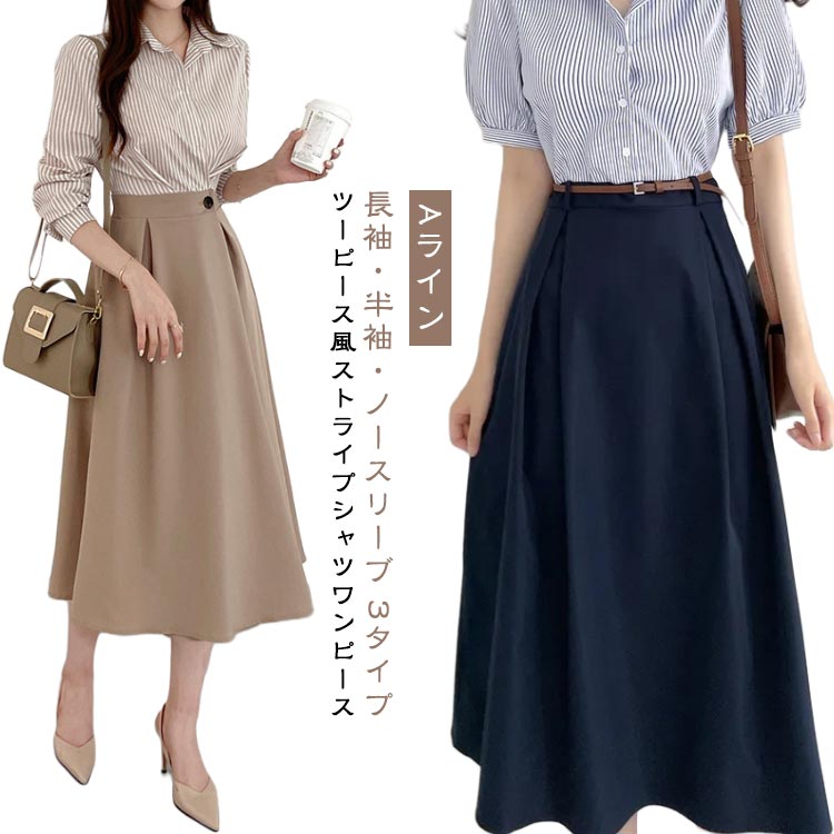 シャツワンピース 夏 ノースリーブ 冬 春 秋 ストライプ ロング ロングワンピース ワンピース Aライン 長袖 きれいめ レディース フレア ツーピース風 半袖 シック ロング丈
